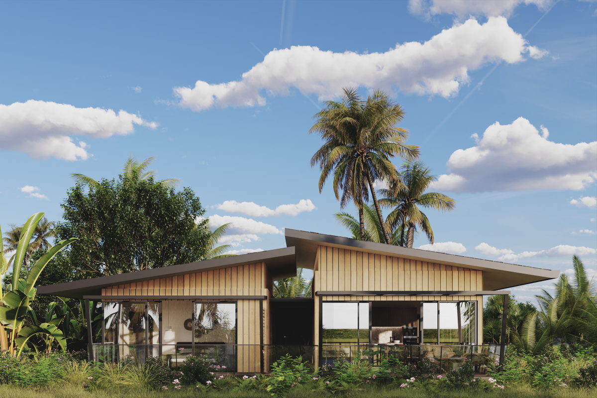 The villas are built into the ground or placed on a strong iron structure, depending on the nature of the land. The individual villas are then designed in one to three bedroom layouts, with the lounge area meaningfully separated from the bedrooms and bathrooms by an entrance hallway. Timber and ceramic tiles are standard in the interiors and it is possible to choose superior tropical woods. Roofs protect the residents from rain and sun, while the house offers unobstructed views of its tropical garden and landscape. The roofs can also be supplemented with solar panels for even greater self-sufficiency.