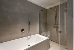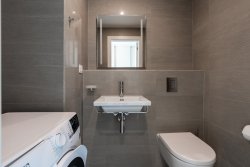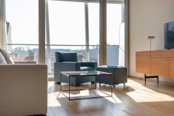 High-quality materials were used in the project. Solid wood floors. Large-format tiles in the bathrooms. Underfloor heating throughout the apartment. French windows with sound insulation ensuring peace and quiet as well as excessive lighting. Each room has its own entrance to the terrace.
