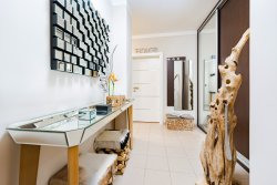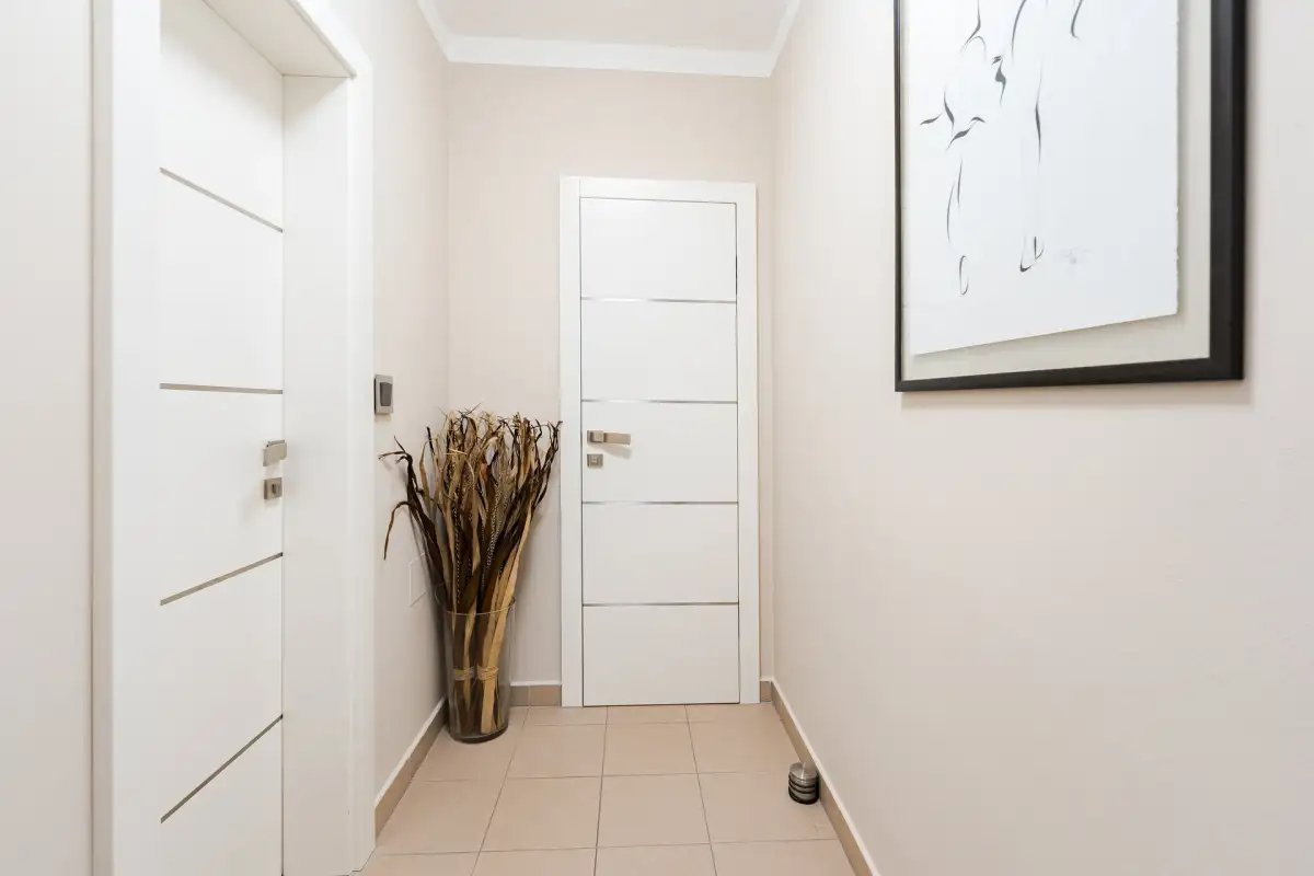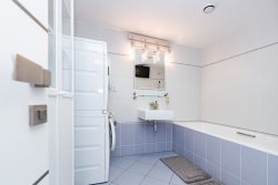 The layout includes a living room with a sofa bed, a kitchenette equipped with all appliances, a bedroom with a double bed, a bathroom with a bathtub and a sink and a separate toilet. The apartment is rented completely and luxuriously equipped. Built-in storage spaces. Quality Quantum bed. Terrace with outdoor seating and barbecue. The bathroom also includes a washing machine and dryer.