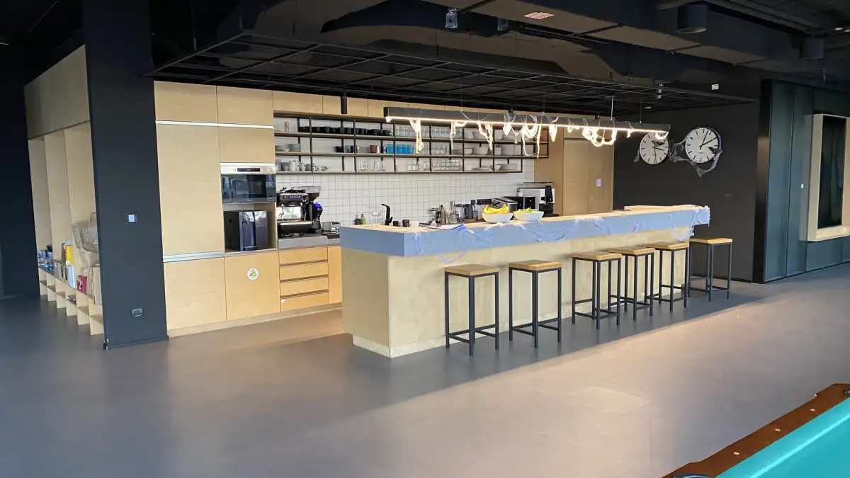glass partitions, designer lighting, exposed ceilings in public areas and