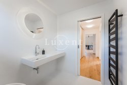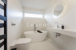 The house also has three bedrooms, two of which have separate access to the garden. The third bedroom has its own spacious dressing room and a separate bathroom with shower and toilet. Hallway with spacious fitted wardrobes and a luxurious Kartell designer bathroom with bath, basin and toilet.