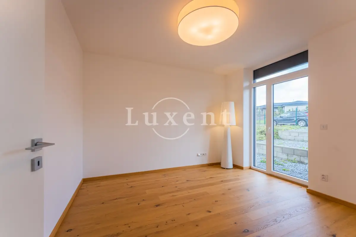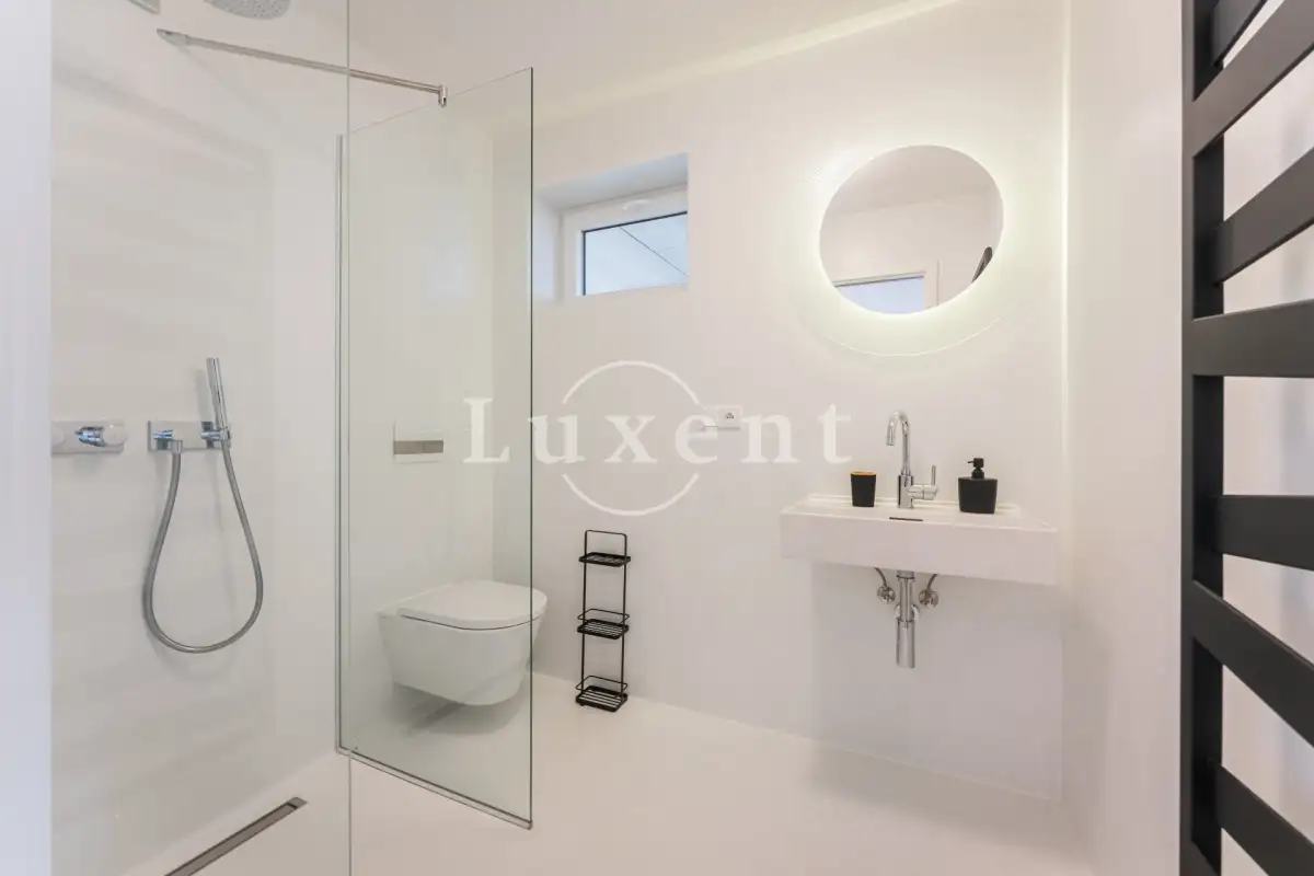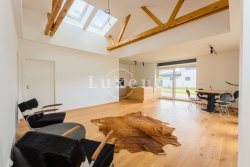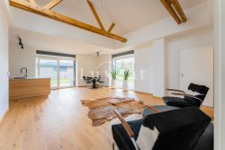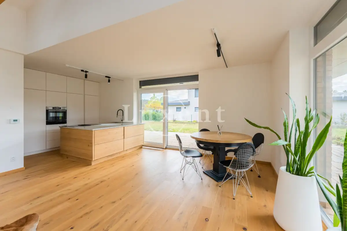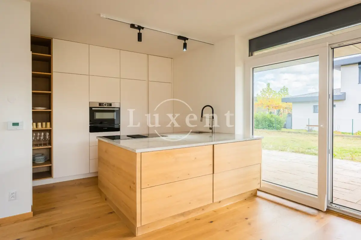 The layout of the house includes an entrance hall with built-in wardrobe, airy, sunny and spacious living-dining room and a luxurious custom-made kitchen with marble worktop, kitchen fully equipped with built-in appliances - fridge-freezer, oven, microwave and dishwasher, hob with extractor hood. The kitchen has an entrance to the utility room with gas boiler, which can also be used as a pantry. The living room has large French windows and access to the garden with outdoor seating.