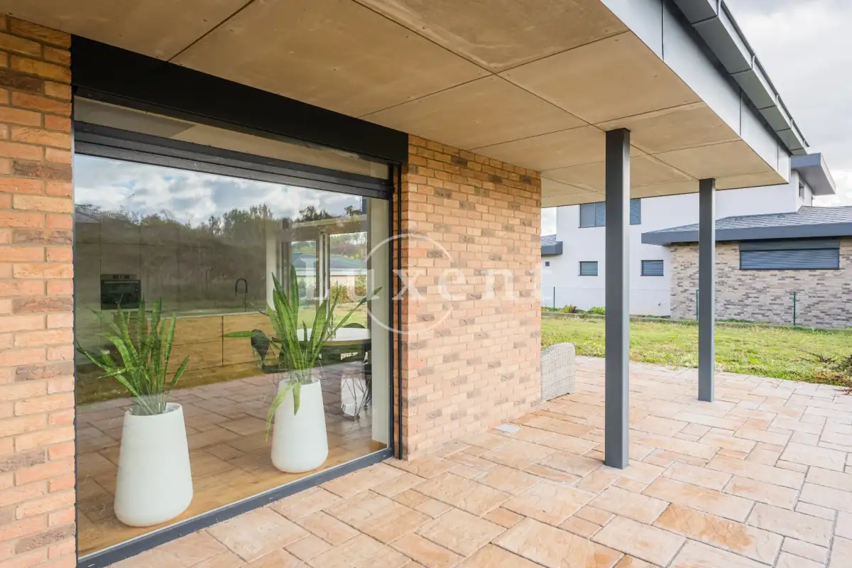 The house is designed to an energy efficient standard and is heated by a gas boiler. Modern and airy interior, heated wooden oak flooring, storage in the hallway and electrically operated roller shutters throughout the house. There is a chimney connection in the living room to accommodate a fireplace. The house has its own 25 m deep well with connection to the house, as well as a 10 m³ rainwater tank.