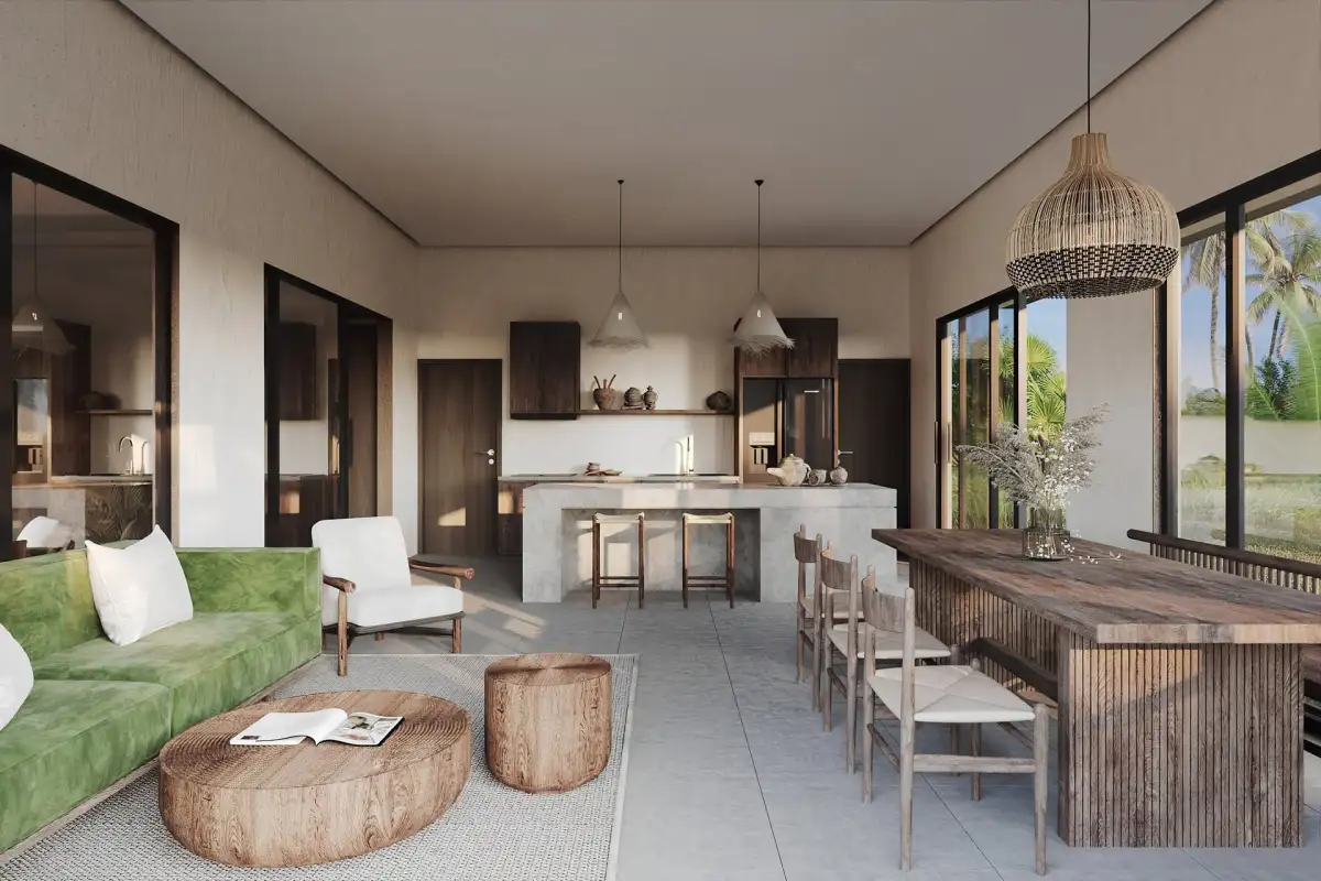 You can choose from houses in three variants - one, two or three bedrooms. The layouts are variable and can be modified as desired. The social living area of the interior is separated by a practical entrance hall from the bedrooms and bathroom. The attractive and functional minimalist design of the houses is complemented by extensive private grounds with spring water, mature trees and a fertile garden where you can harvest your own tropical fruits. In addition to the pleasant atmosphere of the design house, you will therefore also get your own unique rich green privacy. The interior materials are wood and ceramic tiles, but you can choose from many types of superior tropical wood floors.