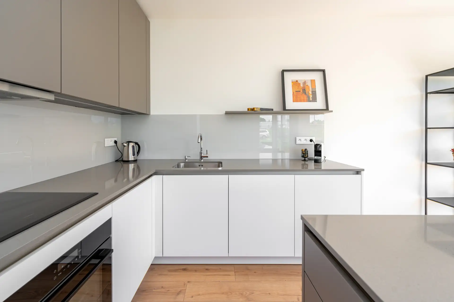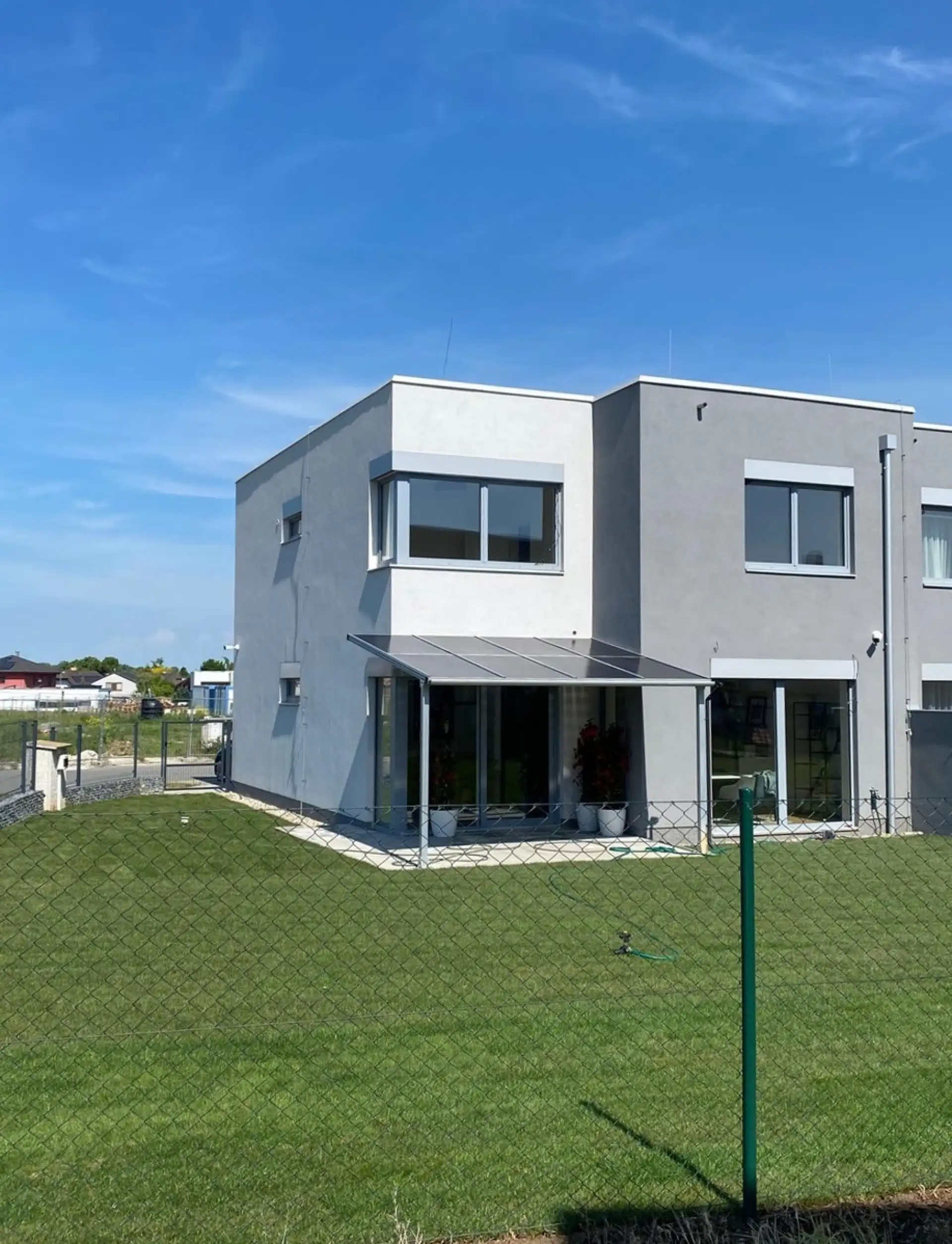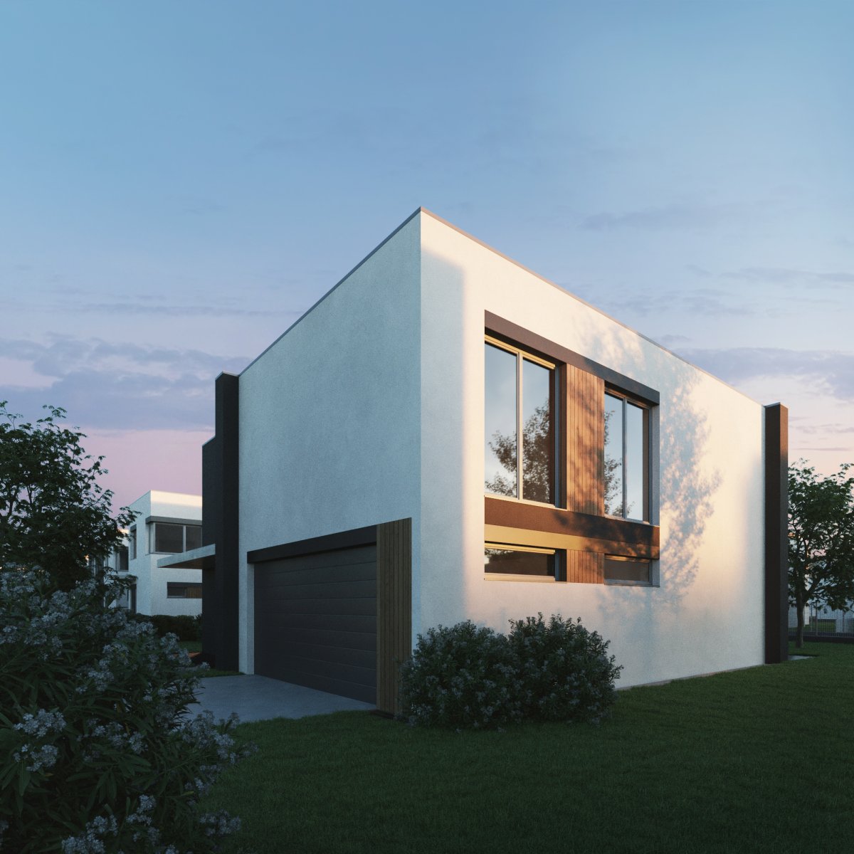 We are currently working on furnishing a model house. A kitchen and pergola with a photovoltaic system has been completed and can be implemented in all houses as part of client changes. All the houses offered have the preparation for photovoltaics built in the standards of the house. The house is also fitted with furniture to illustrate the interior design possibilities.