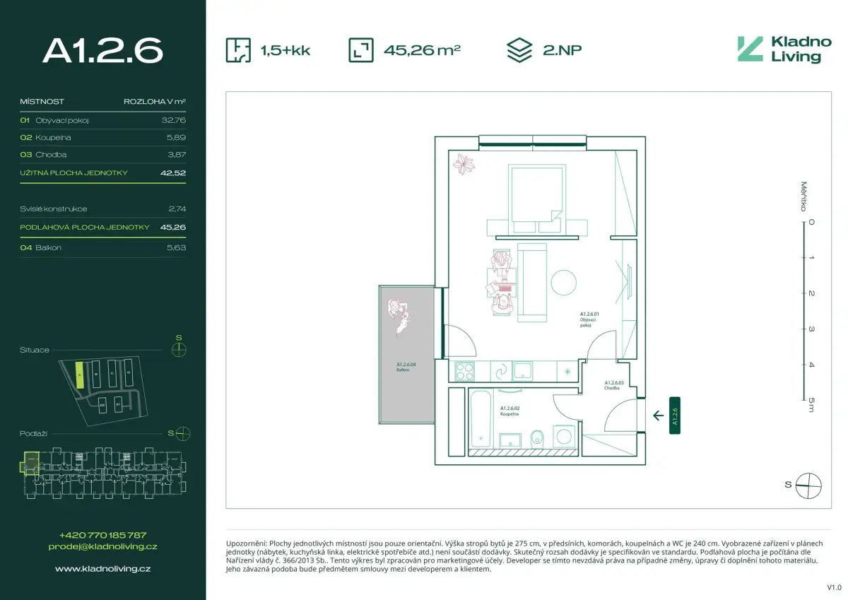 We are offering for sale a modern apartment 1+kt (1,5+kt) with a floor area of 45,2 sqm and a balcony of 5,6 sqm in the Kladno Living residential project, which is being built in one of the most attractive locations in the city of Kladno – Kročehlavy. This new development project represents a unique opportunity for those looking for new apartments in Kladno or an investment in real estate with high appreciation potential.