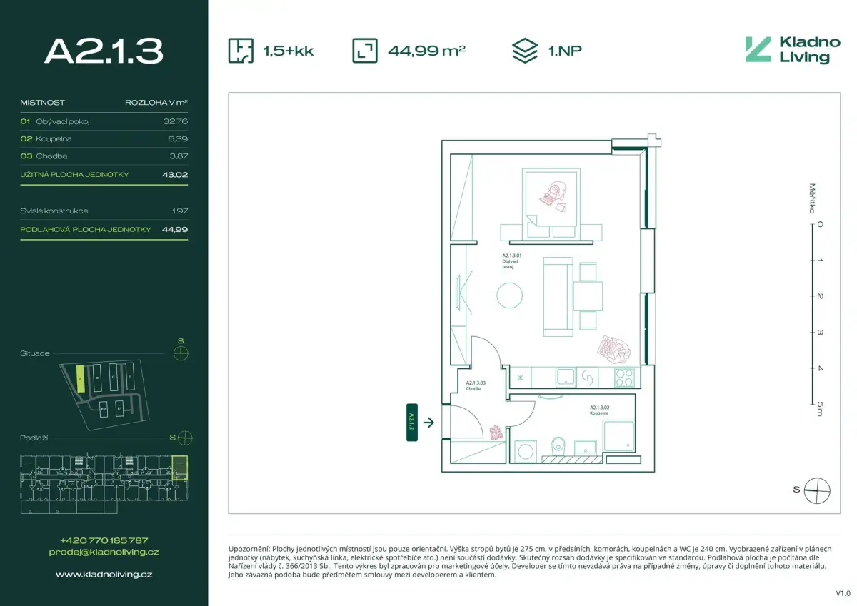 | KL-B123 | 1 + kitchenette | 1st floor | 43 m2 | 45 m2 | No / 6 m2 / No | No | 5 250 000 CZK | Detail |