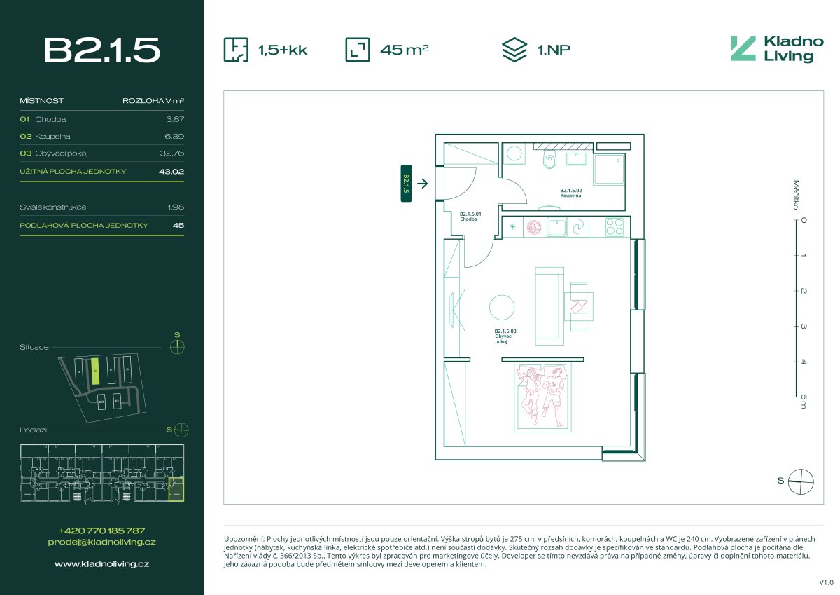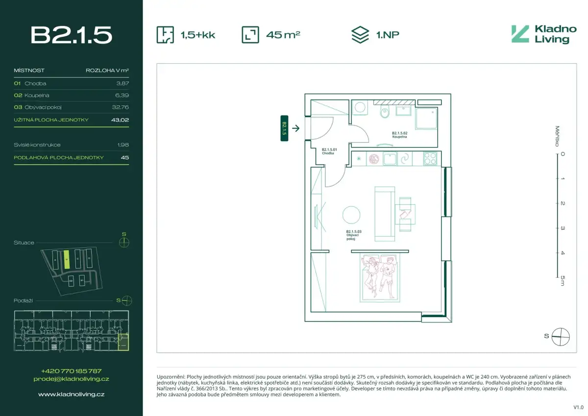 | KL-B123 | 1 + kitchenette | 1st floor | 43 m2 | 45 m2 | No / 6 m2 / No | No | 5 250 000 CZK | Detail |