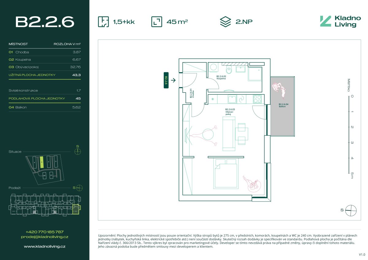 | KL-B226 | 1 + kitchenette | 1st floor | 43 m2 | 45 m2 | No / 6 m2 / No | No | 5 295 000 CZK | Detail |
