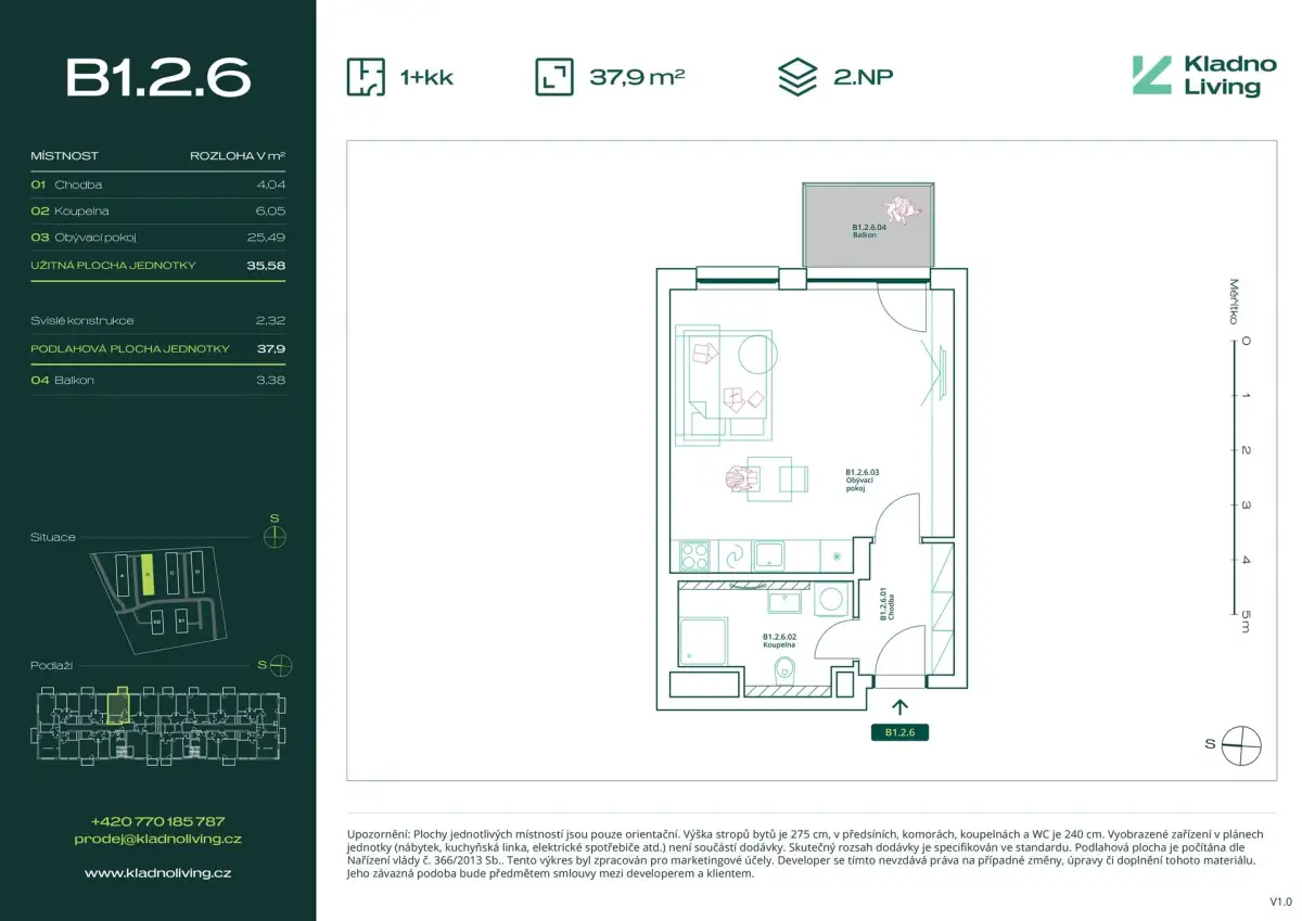 | KL-B126 | 1 + kitchenette | 1st floor | 36 m2 | 38 m2 | No / 3 m2 / No | No | 4 580 000 CZK | Detail |