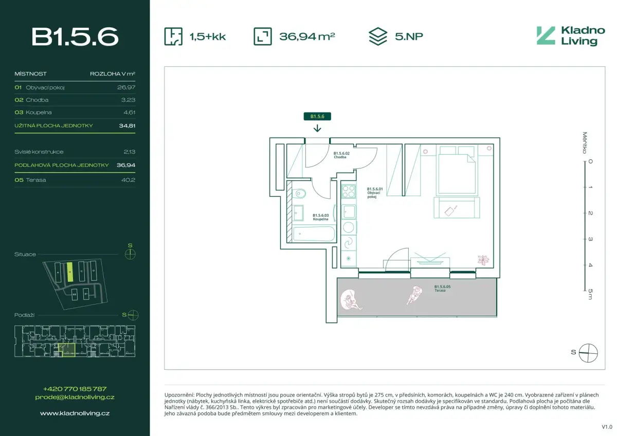 We are offering for sale a modern apartment 1+kt (1,5+kk) with a floor area of 36,9 sqm with a terrace 40,2 sqm in the Kladno Living residential project, which is being built in one of the most attractive locations in the city of Kladno – Kročehlavy. This new development project represents a unique opportunity for those looking for new apartments in Kladno or an investment in real estate with high appreciation potential.