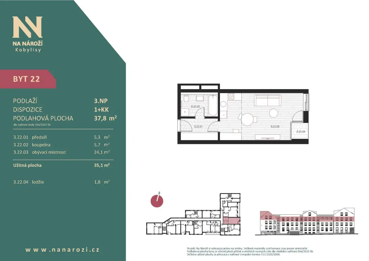 This studio apartment will be built in the Na Nároží project in Prague's Kobylisy district on the 2nd floor of a modern apartment building within walking distance of the metro. The floor area of the apartment is 37.8 sqm, and the total area of the apartment including the loggia (1.8 sqm) is 36.9 sqm. The apartment includes a cellar, which is included in the price.