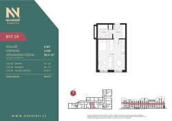 This 1+kt apartment will be built in the Na Nároží project in Prague's Kobylisy district on the 1st floor of a modern apartment building within walking distance of the metro. The floor area of the apartment is 38.4 sqm, and the total area of the apartment is 36 sqm. The apartment includes a cellar, which is included in the price.
