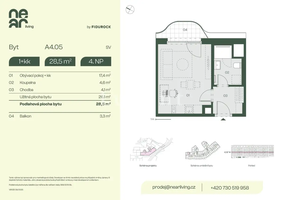 We offer for sale a 1+kt apartment with a floor area of 28.5 sqm and a balcony of 3.3 sqm in the NEAR living development project in Prague 8, located on the border between Palmovka and Karlín.