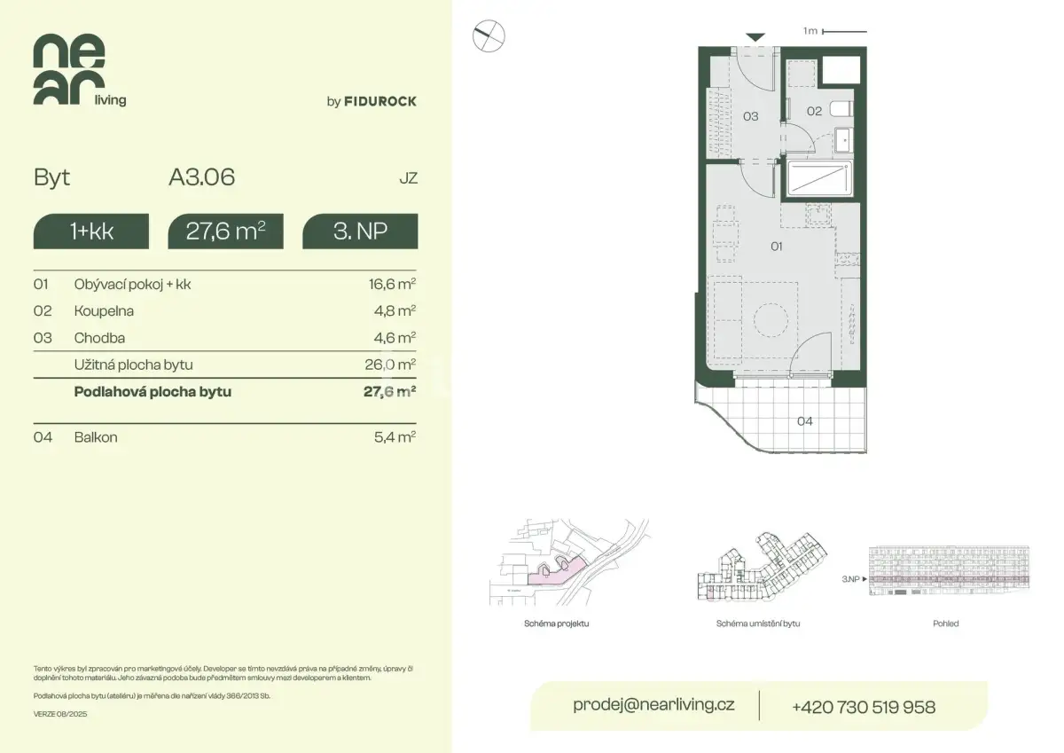 We are offering for sale a 1+kt apartment with a floor area of 27.6 sqm and a 5.4 sqm balcony in the NEAR living development project in Prague 8, located on the border between Palmovka and Karlín.