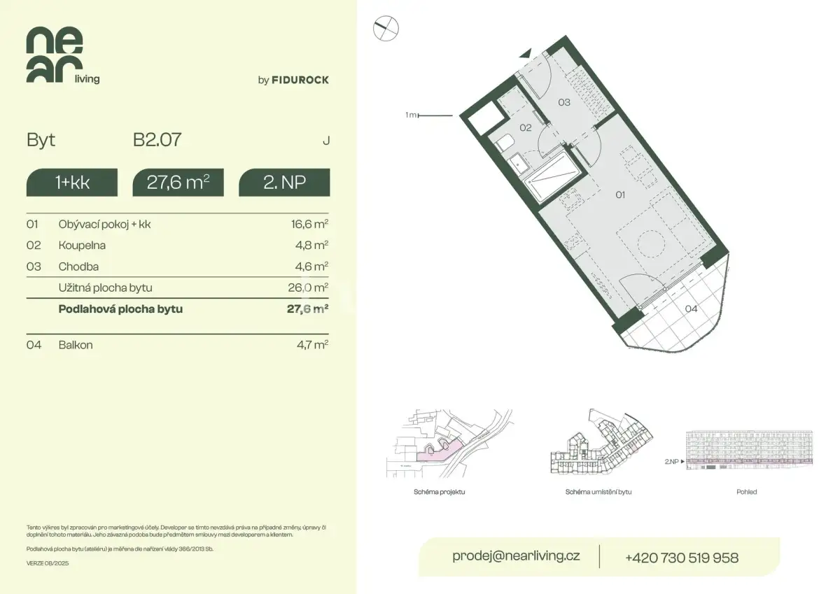 We offer for sale a 1+kt apartment with a floor area of 27.6 sqm and a balcony of 4.7 sqm in the NEAR living development project in Prague 8, located on the border between Palmovka and Karlín.