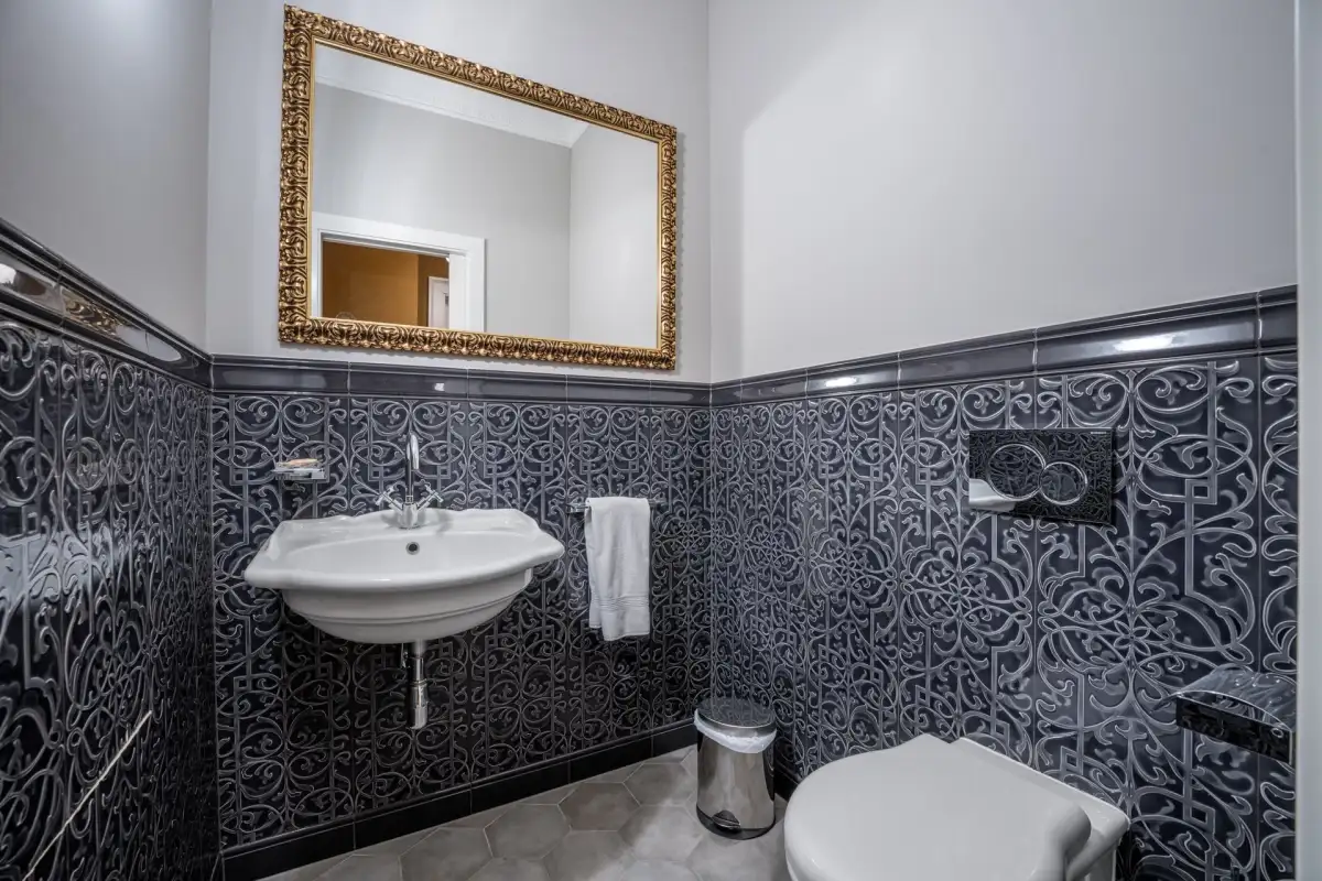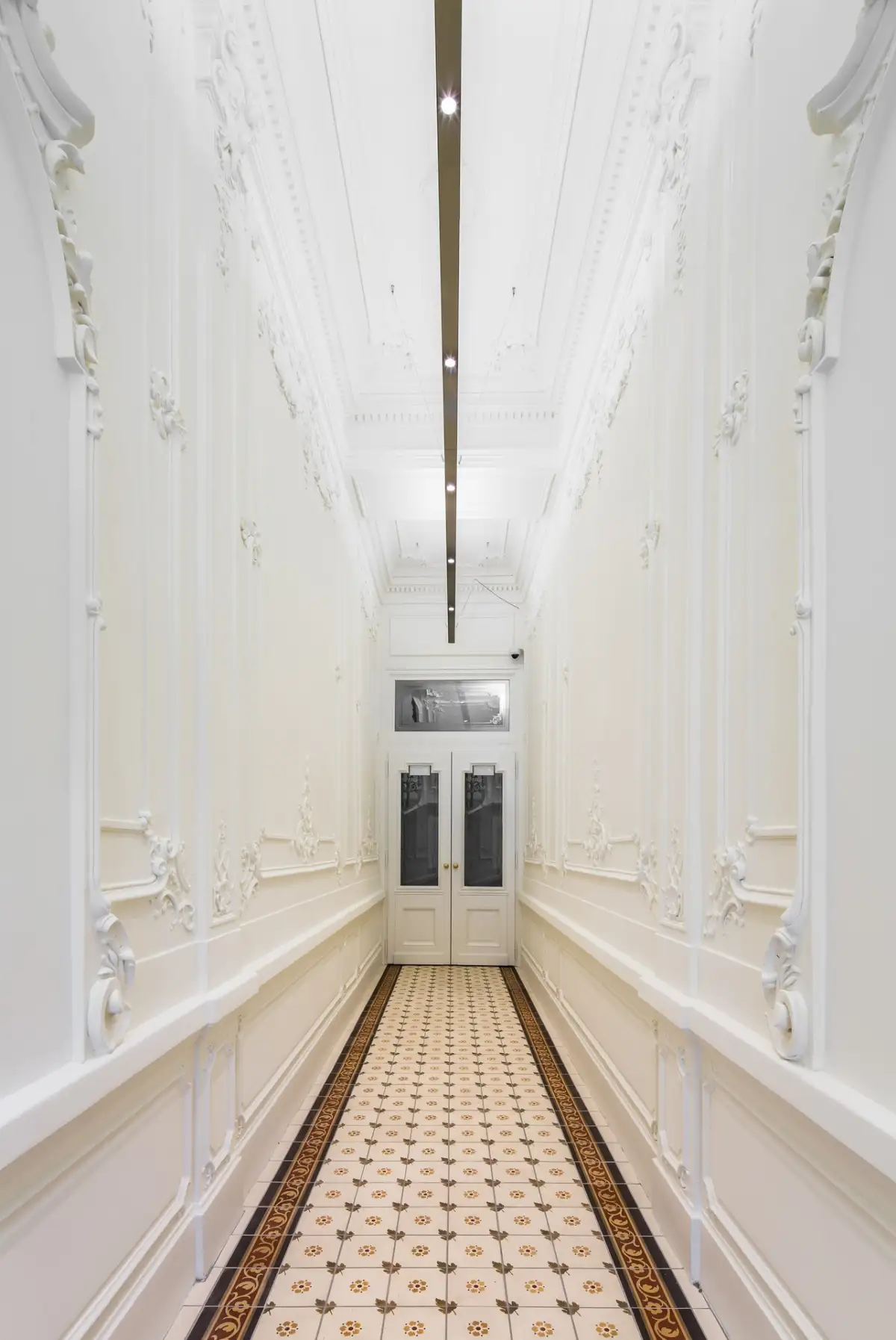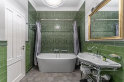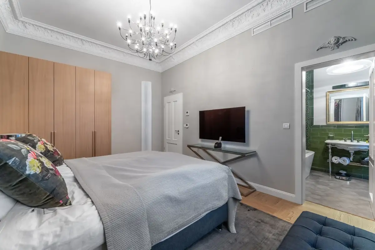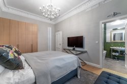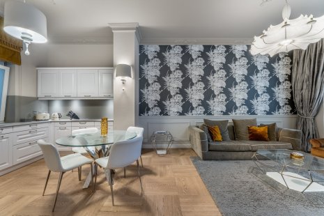 We offer a luxuriously furnished designer apartment "Topaz" in the newly renovated attractive historic building Rubin Palace, on Vřídelní Street, opposite the Mlýnská Colonnade, in the heart of Karlovy Vary. It is an apartment on the 2nd floor of this residential building with an elevator. The layout is 2+kt with a floor area of 63.3 sqm and a terrace measuring 20.6 sqm. The building was constructed in 1897 according to the design of Karlovy Vary architect Karel Heller and was completely renovated in 2016 as a listed building according to the design of Italian engineer Stefano Stramigioli and completed by architects from the Soukup studio. Seven luxury apartments with spacious terraces in the courtyard or balconies facing the colonnade were created here.