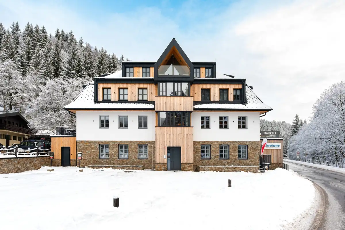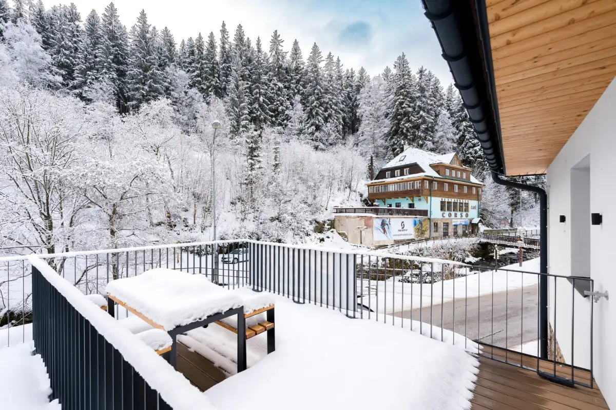 New beautiful furnished 2+kt apartment (53,2 sqm) with terrace (19,7 sqm) is located on the 2nd floor of the newly built apartment house Máj from 2023 situated in the centre of Pec pod Sněžkou, in the neighbourhood of restaurants, cafes and wellness & spa. The building has an elevator and the apartment has a cellar (1.5 sqm) and one outdoor parking space.