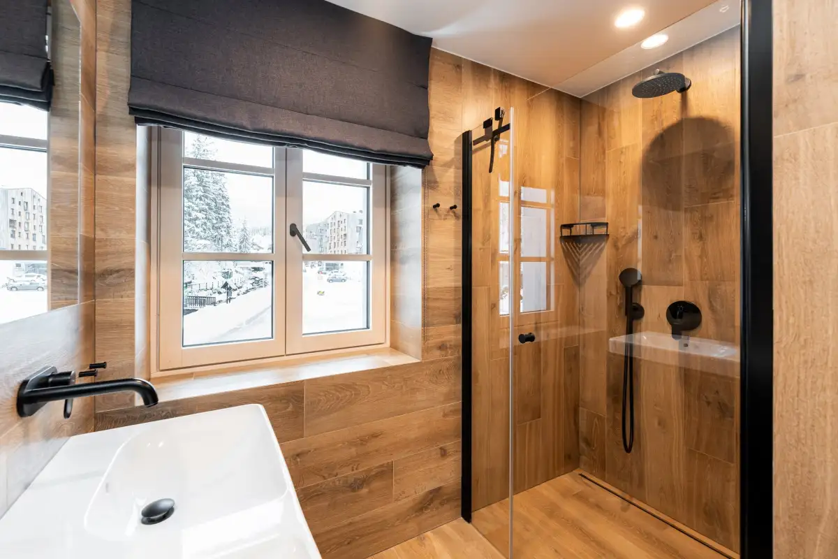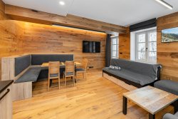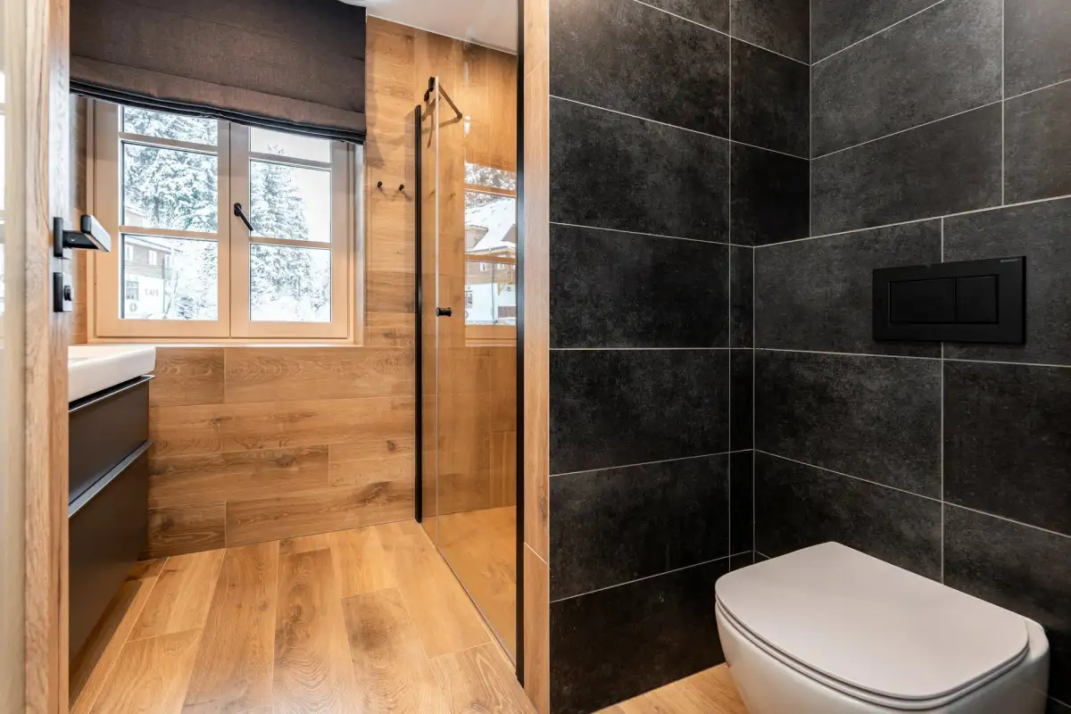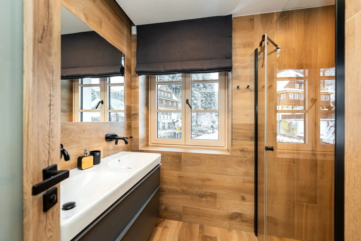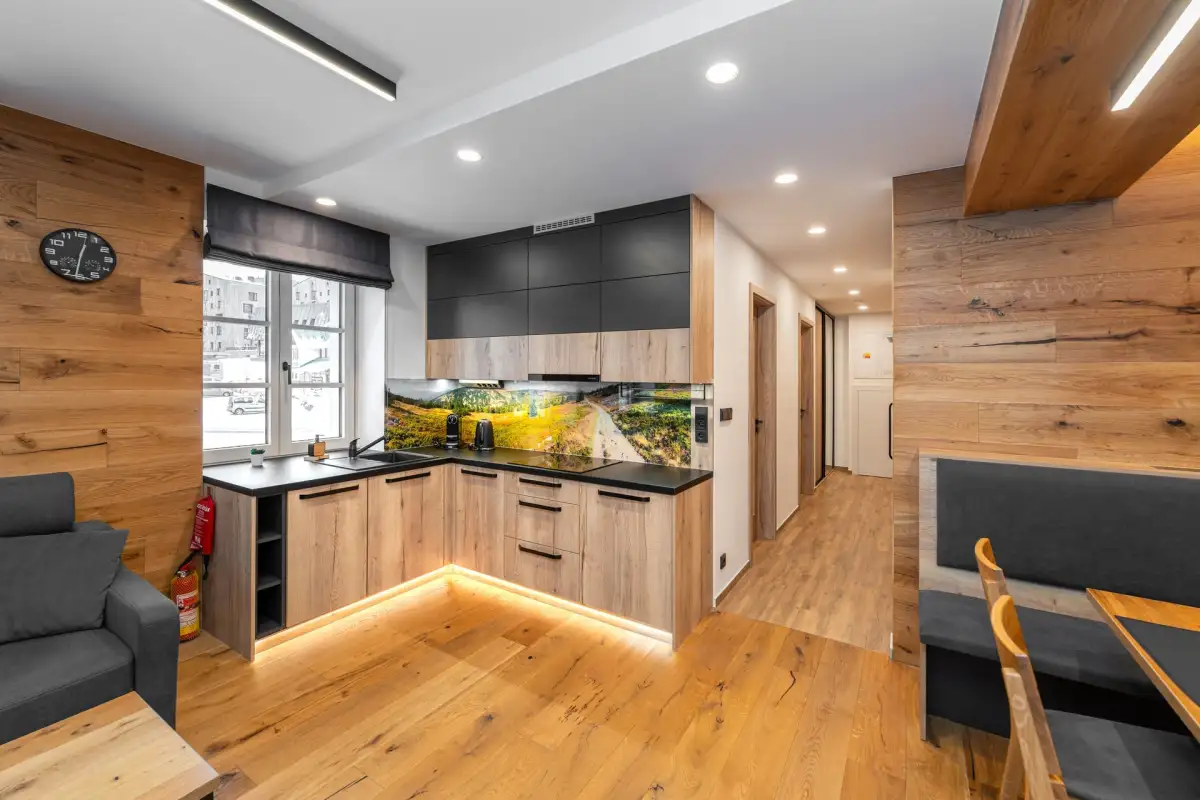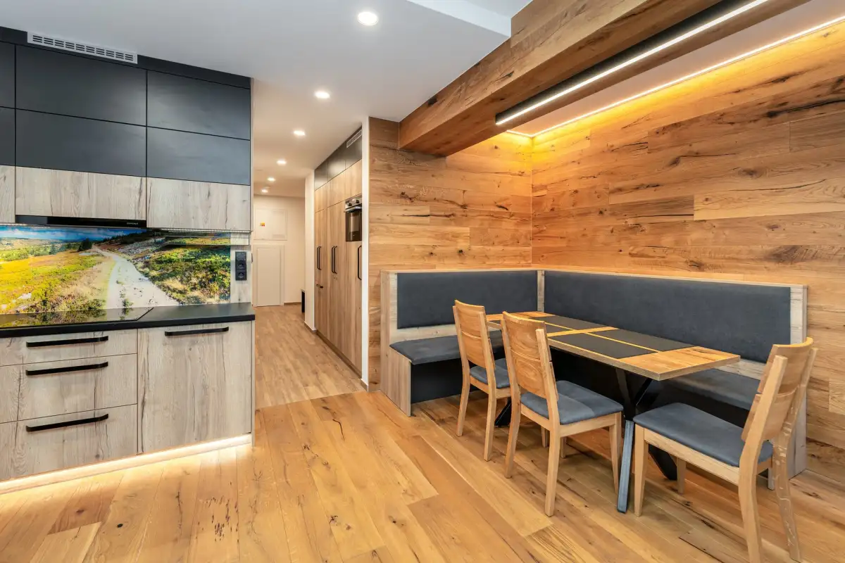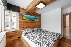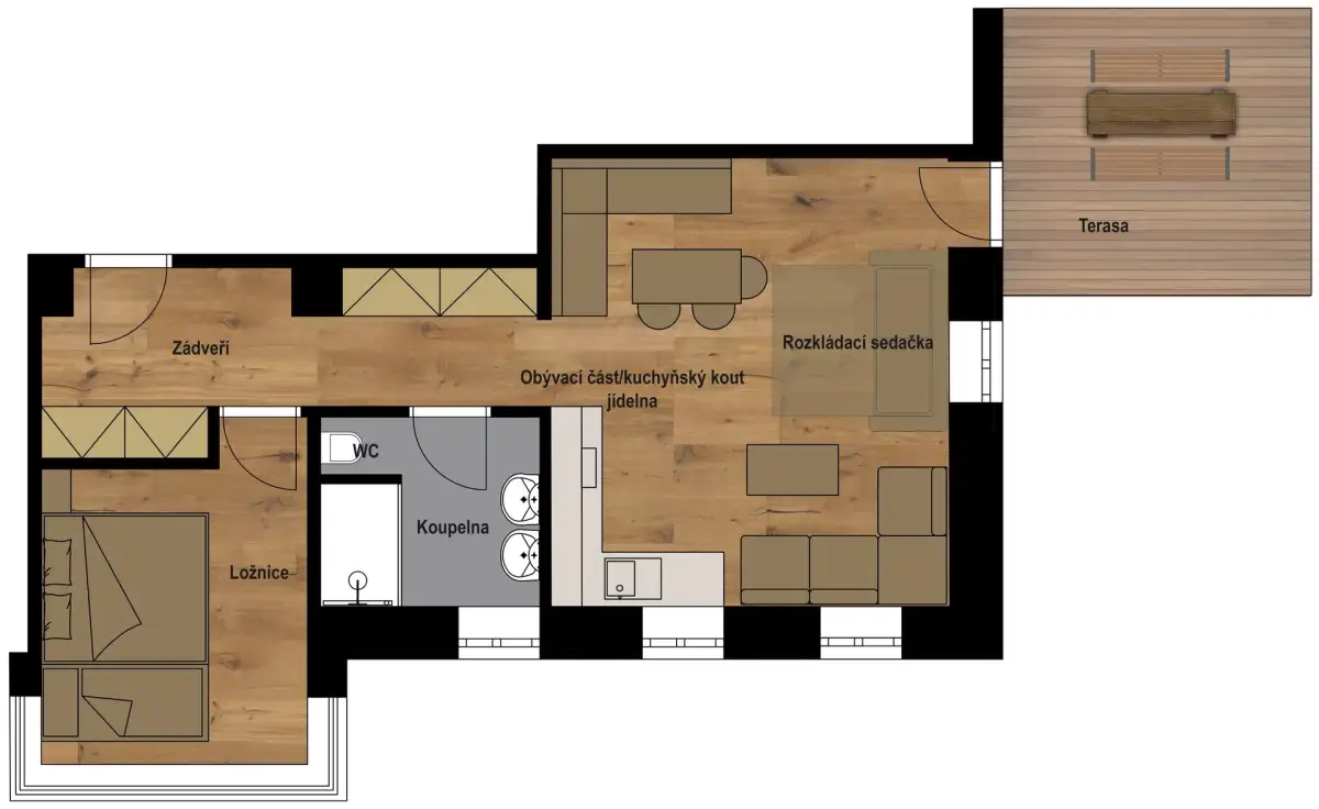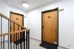 The apartment is modernly furnished with furniture and equipment. There is a hallway with two built-in wardrobes, a separate bedroom with a double bed and a pull-out bed and a large living room with a dining area and an equipped modern kitchen (oven combined with microwave, fridge, ceramic hob and dishwasher). There is high-speed WiFi internet, satellite, large smart TV with Czech channels and access to YouTube, Netflix and streaming services. The living room has access to a spacious terrace with seating. The apartment has designer wood paneling on the walls and sanitary ware in the bathroom with shower (see photo).
