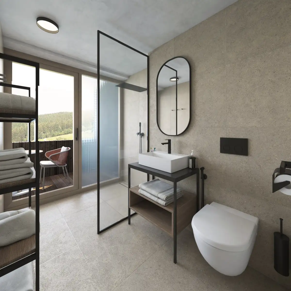 The offered apartment has a layout of 2+kt and a total area of 43.1 sqm with a loggia of 3.6 sqm. It offers a bedroom and a living room with access to the terrace, as well as a bathroom with shower and toilet and a corridor.