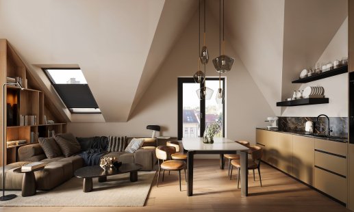 The apartment is equipped with high-quality furnishings. The interior partitions are brick. The floors feature Rigid Acoustic vinyl with an ultra-realistic Bostoniam Oak Honey design and an integrated acoustic underlay and Protecshield protective layer for increased resistance to damage. The bathrooms will be fitted with rectified Italian Sintesi tiles, again with a surface finish for easier maintenance. The terrace will feature non-slip, frost-resistant Arenis finesa ceramic tiles on pedestals. The interior doors are Dextura in white, and the entrance door is a security door. Plastic windows with insulated triple glazing in anthracite will emphasize the interesting design of the space in combination with the flooring.