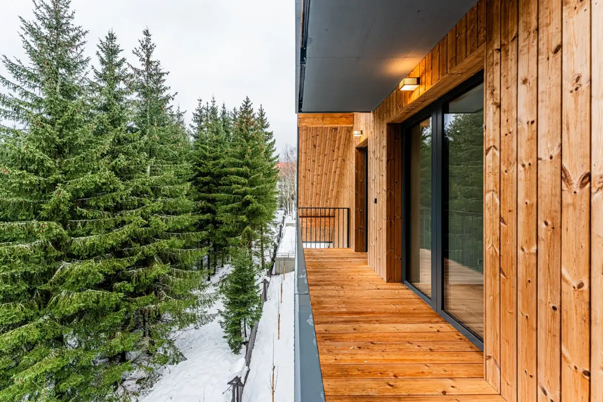 Harrachov Peaks is a luxury project built from quality natural materials with a wellness area with sauna and jacuzzi and a fully equipped fitness room. It presents only 16 modern apartments and thus offers an intimate atmosphere in the house for their owners. Its concept will satisfy those interested in second homes in the Giant Mountains as well as investors with the intention of securing their finances or practicing profitable short-term rentals. The offer also includes apartment management including rentals. The HARRACHOV PEAKS project offers a high standard of furnishings - oak floors, wooden terraces, large format tiles in bathrooms and corridors and more. Heating is provided by heat pumps and is distributed by underfloor heating system. The apartment has heat recovery. The energy class is very economical B.