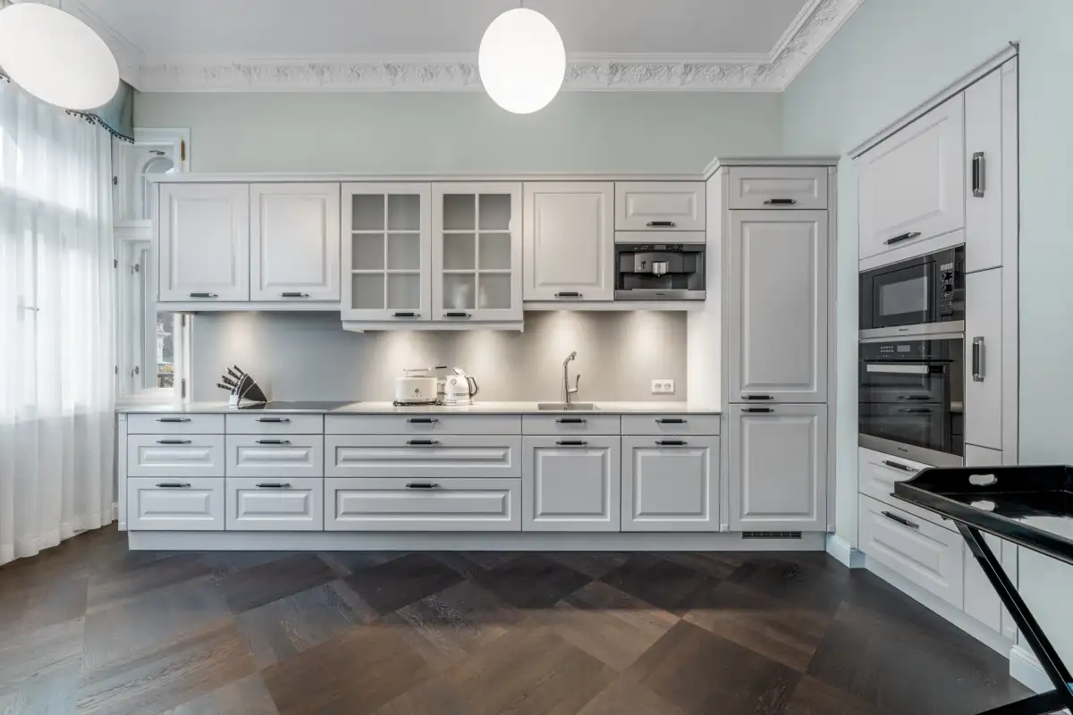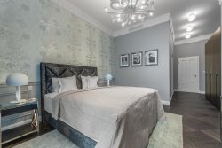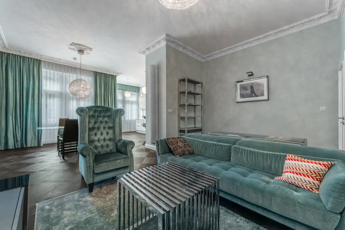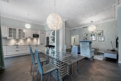 The Diamond apartment has a living room with a balcony overlooking the colonnade and a fully equipped spacious kitchen with windows facing the same direction. There is also a hall and two bedrooms with en-suite bathrooms with toilets – one with a balcony overlooking the colonnade and the other connected to a spacious terrace in the stylish courtyard of the house. The part of the apartment facing the courtyard also features a luxurious spa with two saunas and a bathroom with walk-in showers. The apartment has been exclusively furnished according to the design of renowned German designer Simona Fritz (see photo and video). It offers comfortable living and great luxury, along with beautiful views from the balconies and private tranquility on the terrace. Without any modifications, it is possible to immediately begin living in high comfort or renting out the apartment.