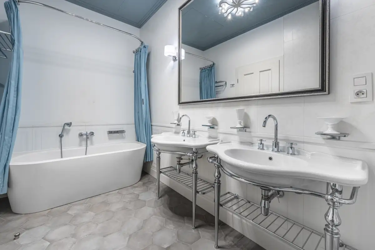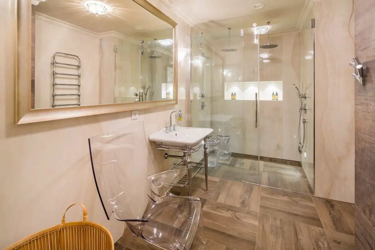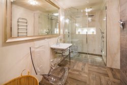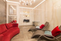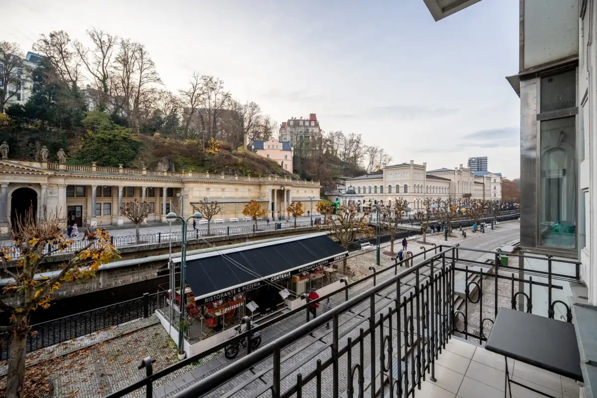 We offer a luxuriously furnished designer apartment called "Diamond" in the newly renovated historic Rubin Palace building, located in the heart of Karlovy Vary, on Vřídelní Street by the spa colonnade. This is a premium apartment with a sauna, a terrace in a stylish courtyard, and balconies facing the colonnade, located on the 1st floor of this attractive residential building with an elevator. The 3+kk layout with two balconies and a terrace is spread over a floor area of 238 m2, with balconies totaling 7.3 m2 and a terrace of 30 m2.