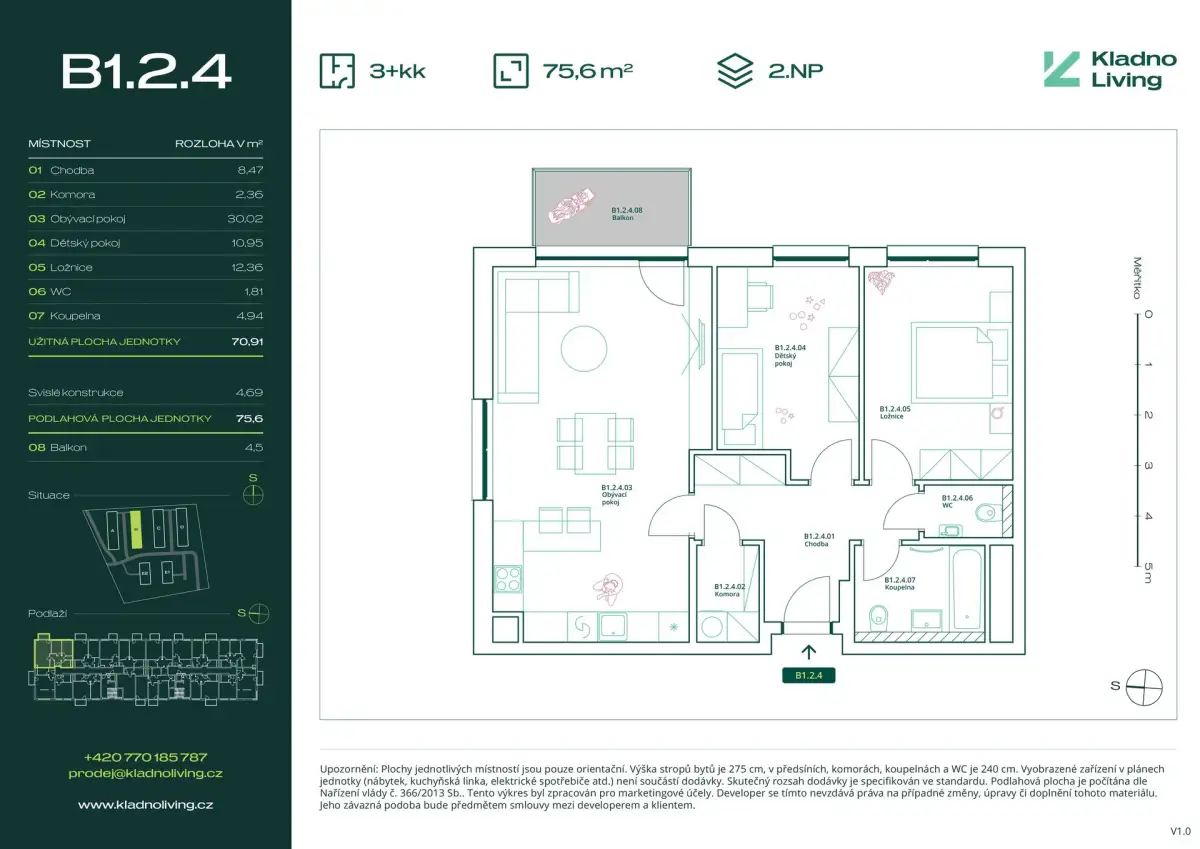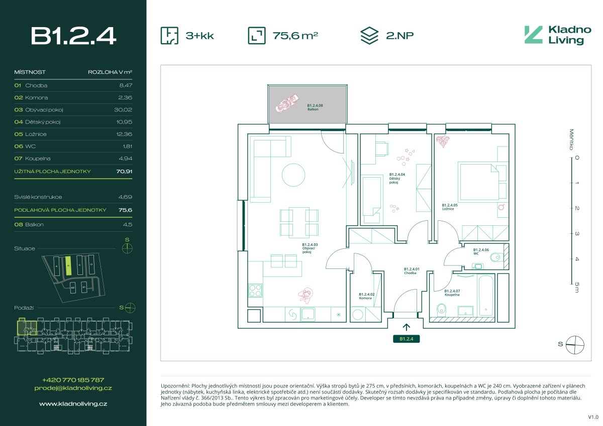 We are offering for sale a modern apartment 3+kt with a floor area of 75,6 sqm and a balcony of 4,5 sqm in the Kladno Living residential project, which is being built in one of the most attractive locations in the city of Kladno – Kročehlavy. This new development project represents a unique opportunity for those looking for new apartments in Kladno or an investment in real estate with high appreciation potential.