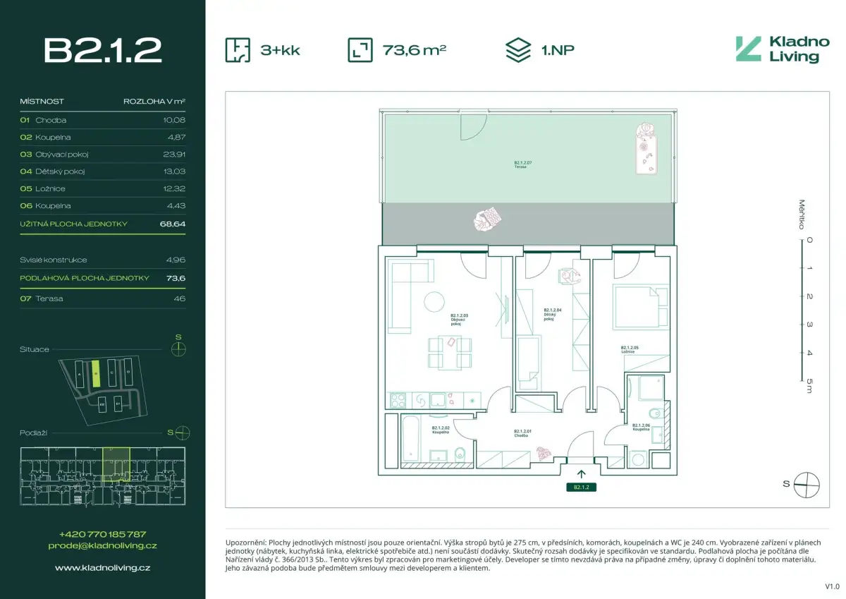 We are offering for sale a modern apartment 3+kt with a floor area of 73,6 sqm and a terrace of 46 sqm in the Kladno Living residential project, which is being built in one of the most attractive locations in the city of Kladno – Kročehlavy. This new development project represents a unique opportunity for those looking for new apartments in Kladno or an investment in real estate with high appreciation potential.