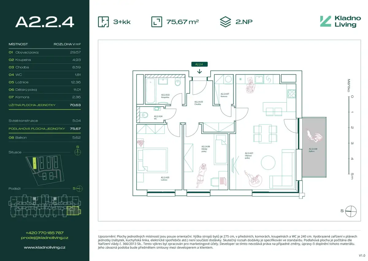 We are offering for sale a modern apartment 3+kt with a floor area of 75,7 sqm and a balcony of 5,6 sqm in the Kladno Living residential project, which is being built in one of the most attractive locations in the city of Kladno – Kročehlavy. This new development project represents a unique opportunity for those looking for new apartments in Kladno or an investment in real estate with high appreciation potential.
