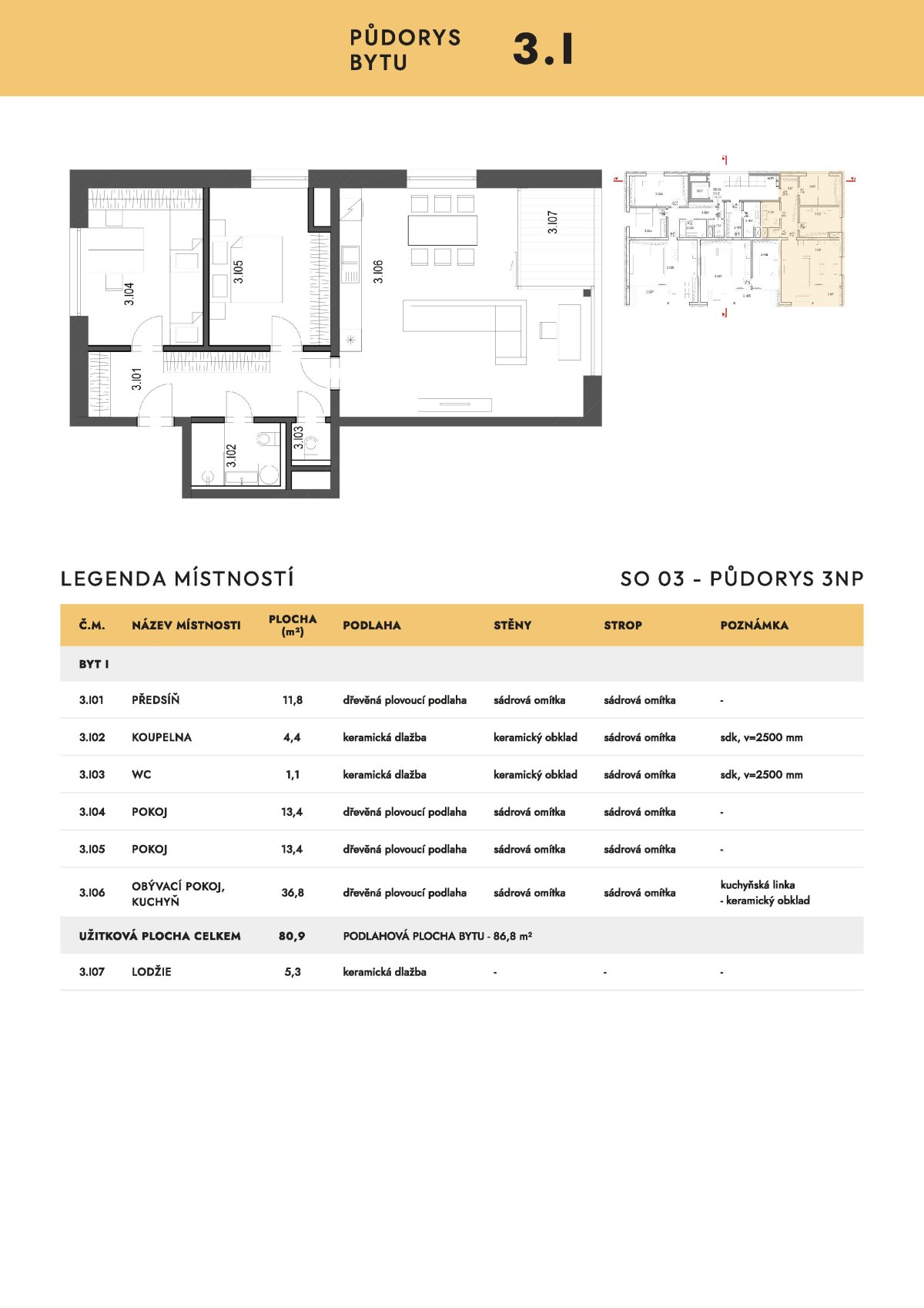 The apartment of 3+kt with a floor area of 87.2 sqm is located on the third floor of building A and includes an entrance hall with access to a separate toilet and a bathroom with shower. There are also two bedrooms and a spacious living room with kitchenette and access to the loggia (5.3 sqm).