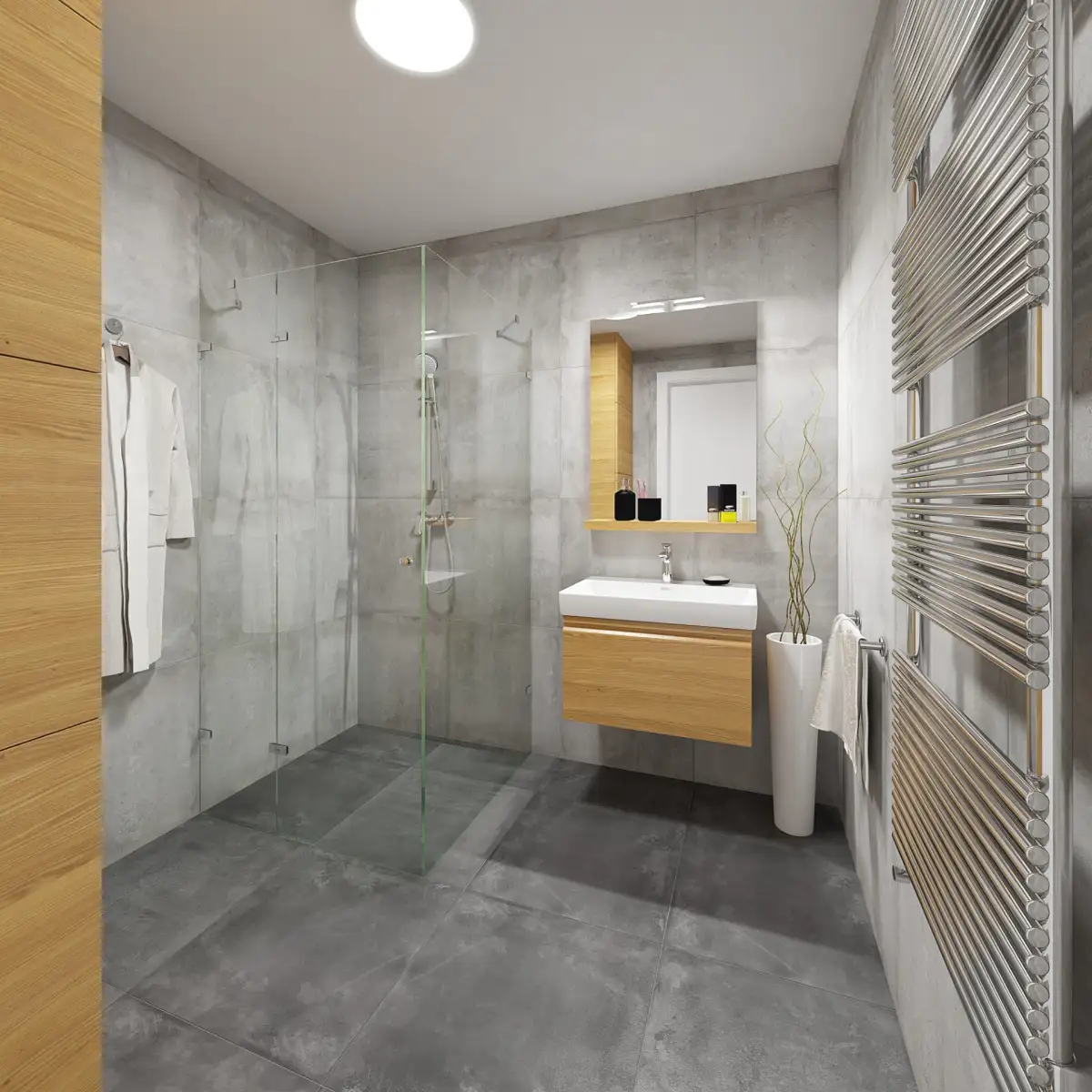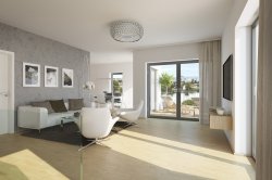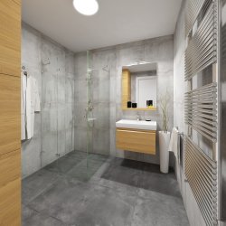 The equipment of the apartments meets the highest standards. Wooden windows and patio doors with triple glazing in anthracite colour and thermally insulated wooden roof windows with double glazing. In the living rooms there is a wooden multi-layer glued floor combined with elegant 60x60 tiles in two standards (Villeroy & Boch grey, Abitare anthracite imitation concrete). Ceramic wall tiles in the bathrooms also in two standards (30x60 Villeroy & Boch white, 60x60 Abitare grey imitating natural concrete).