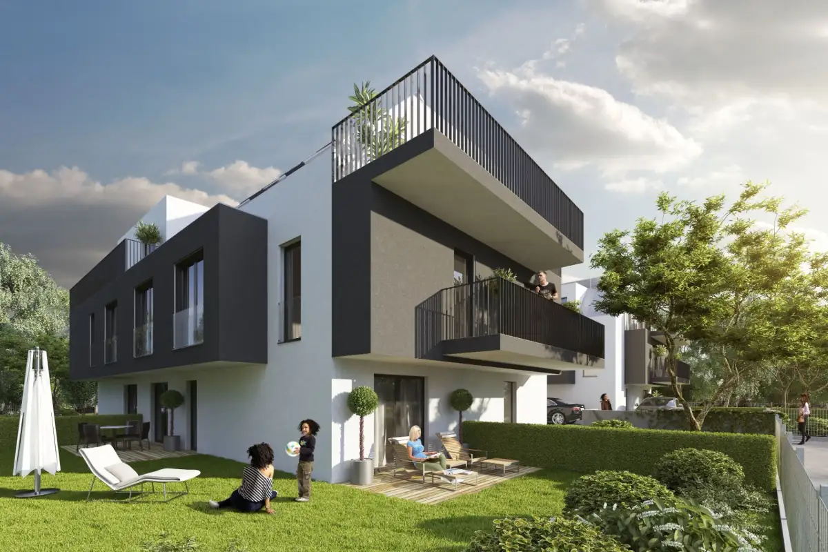 Anglerweg is an exclusive residential project of two apartment buildings with a total of 12 apartments. The project is built in a low-energy standard, thanks to a central heating system with its own central boiler house and a solar system on the roof, which brings a significant reduction in operating costs and an improvement in the ecological balance of the building. The insulated façade is covered with thin-film plaster, while the pitched roofs are covered with flat metal sheeting and a walking layer.