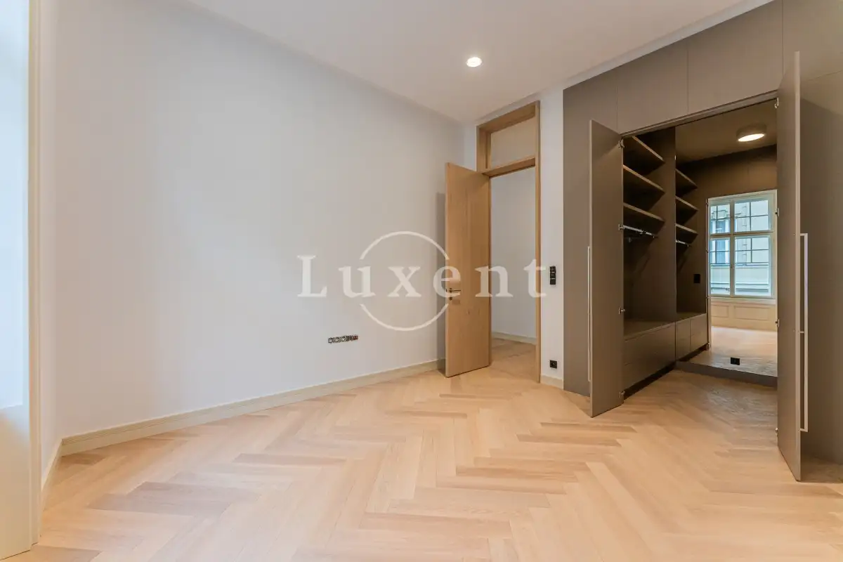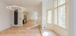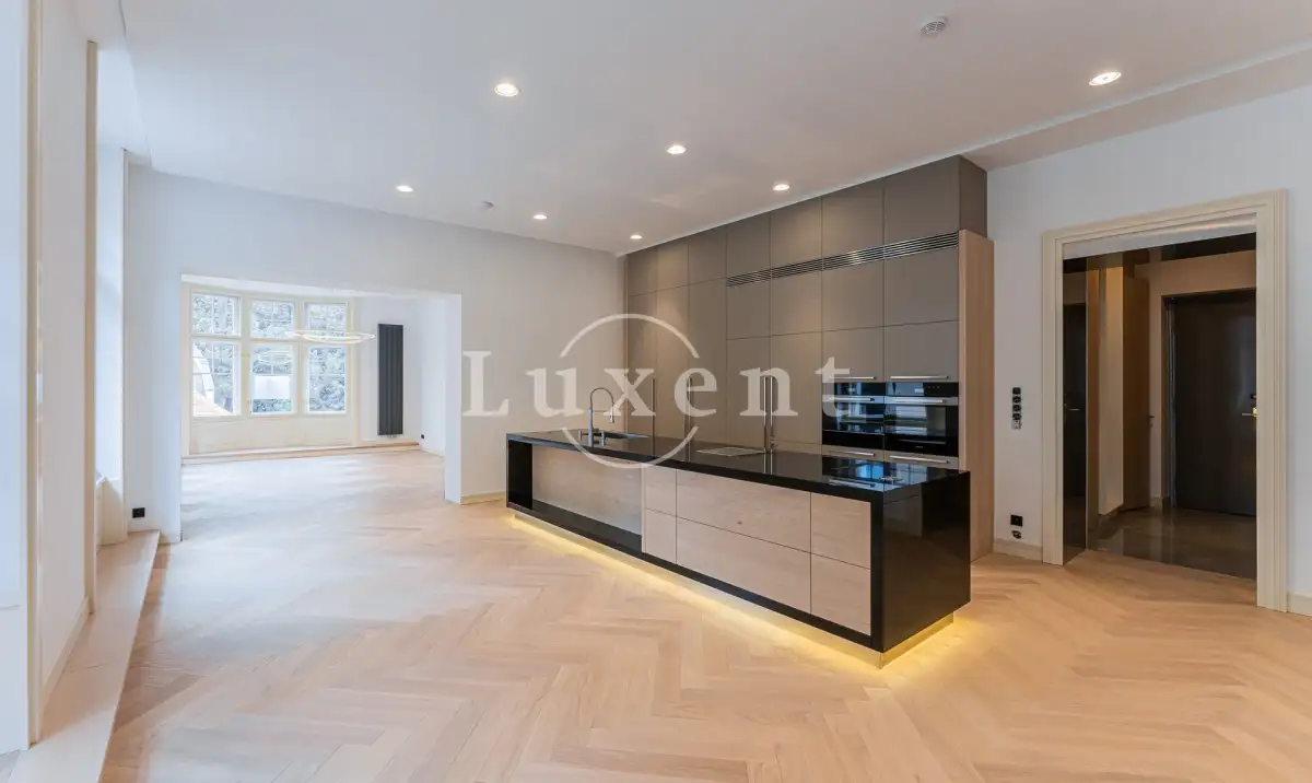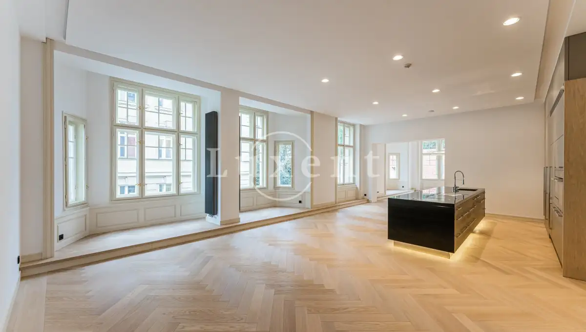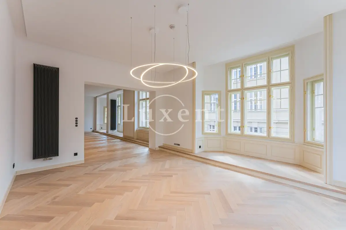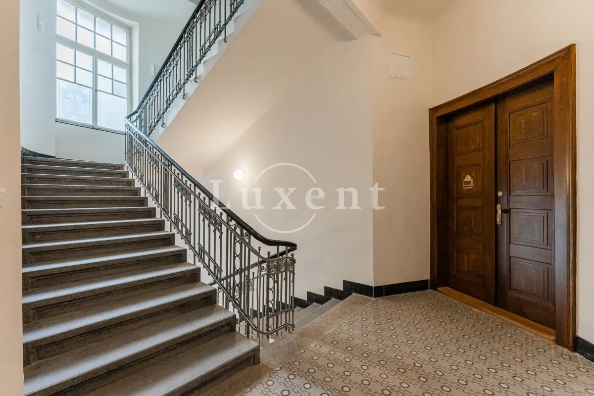 We offer a bright and spacious apartment 4+kt of 169 sqm. This apartment is situated on the third floor of an apartment building on the corner of Široká and Valentinská street. The house was designed by architect Richard Klenka, and is built in the spirit of modernity. Its buildings abound in a number of remarkable details and perfect craftsmanship.