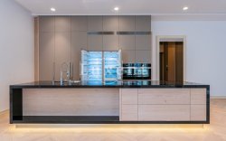 The interior of the apartment is the work of Ing. Sheet. Ivana Dombková. It includes an entrance hall with storage spaces (9.5 sqm), a toilet (2.5 sqm) and a technical chamber (1.8 sqm). From the hall you enter the social part oriented to the west side and to the quiet zone oriented to the southwest. The social area includes a kitchen and a dining room with a relaxation area (64.5 sqm). Behind the kitchen is hidden the original chamber, which now has the purpose of a laundry room and pantry (3.8 sqm). To the right of this central room is a corner room (32.1 sqm), which can be used as a living room, study or bedroom. To the left of the kitchen with dining room is a quiet area. It is separated by a glass wall with an entrance hall, from which you enter the bedroom (15.6 sqm) with a dressing room (4.6 sqm). It includes a bathroom with toilet, bath and sink (4.7 sqm). The next bedroom (16.1 sqm) is oriented to the courtyard. It has a small balcony (2.2 sqm). The bedroom is connected to the bathroom (4.6 sqm) with sink, shower and toilet. In front of the bedroom is a corridor (9.9 sqm), which serves as a dressing room. This corridor connects to the entrance hall of the apartment.