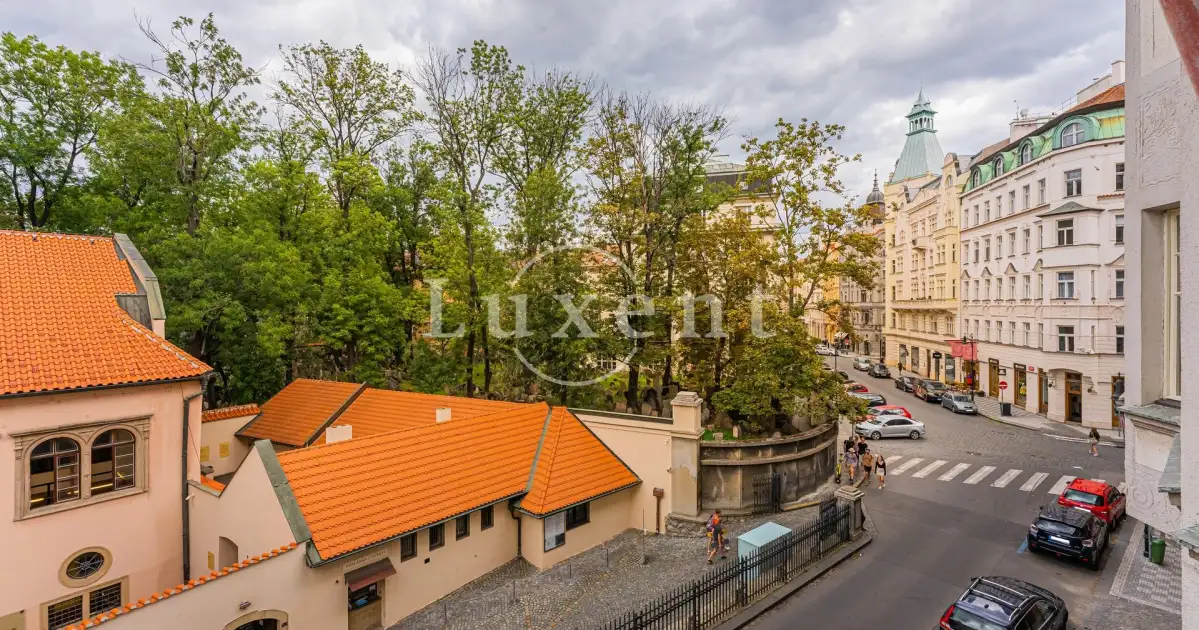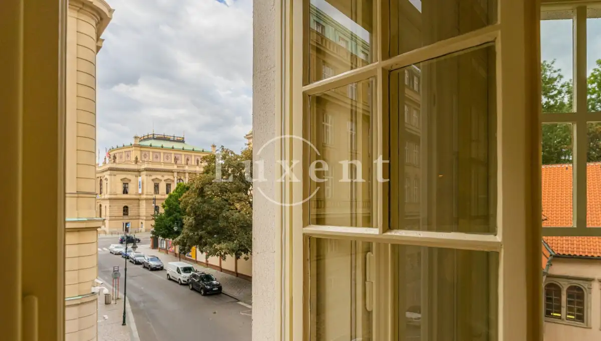 The generous layout, high ceilings and large brightness of the apartment, thanks to the large windows, give this space timelessness and pleasant comfort. In addition to the window from one bedroom facing the courtyard, the other windows are facing public buildings and other sights of old Prague. There is a view of the Museum of Decorative Arts and partly of the Rudolfinum, the Pinkas Synagogue and the building of the Faculty of Arts of Charles University.