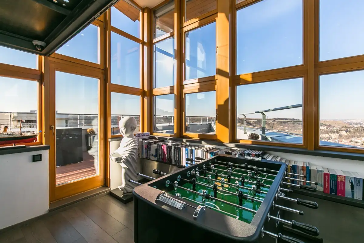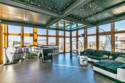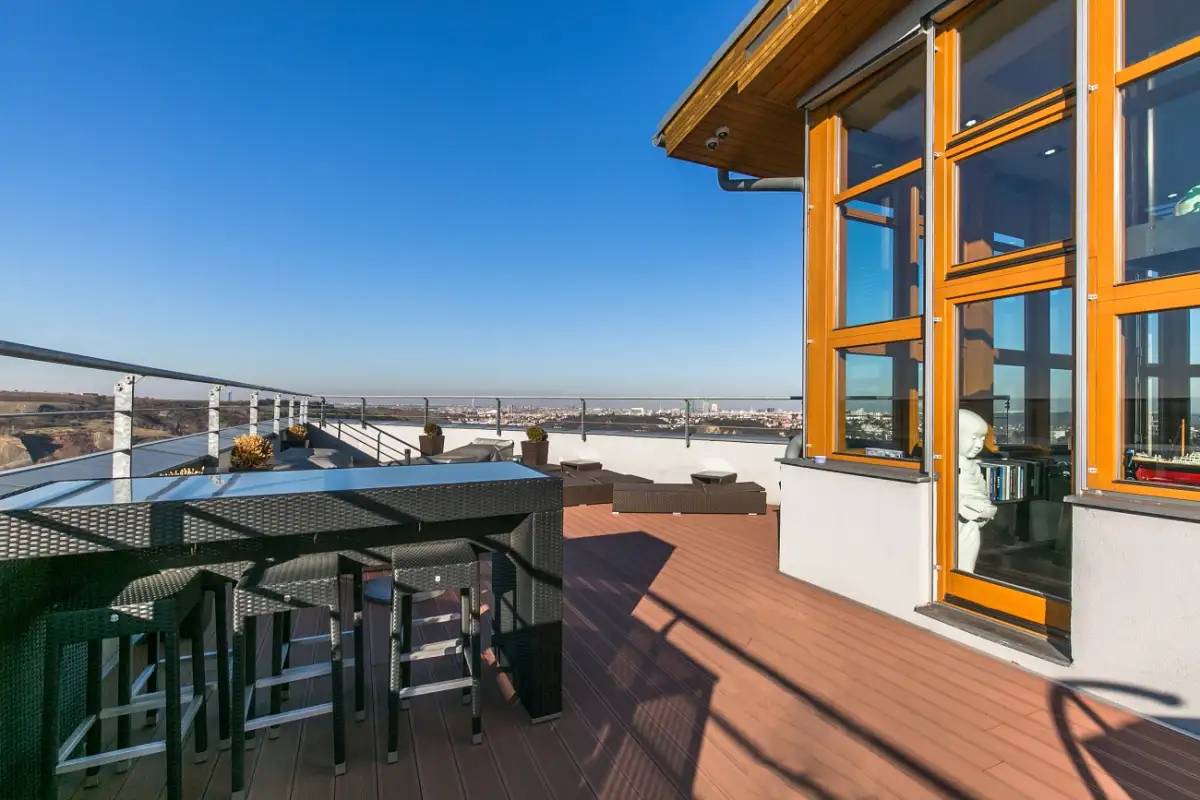 We offer for sale an impressive and luxuriously furnished apartment with living area of 210 sqm. The apartment has two terraces total of 230 sqm with spectacular views of the Prokop Valley. It located on the last floor of a new building with an elevator, which is situated in a quiet residential area of Barrandov. The flat includes an entrance hall, three bedrooms, two bathrooms with toilets and a separate toilet. Spacious living room with dining area, fully equipped kitchen and bar. From the living room a staircase leads to the gallery with a double bed, TV, dressing room and study. The interior complements the many works of art and sculptures.