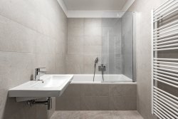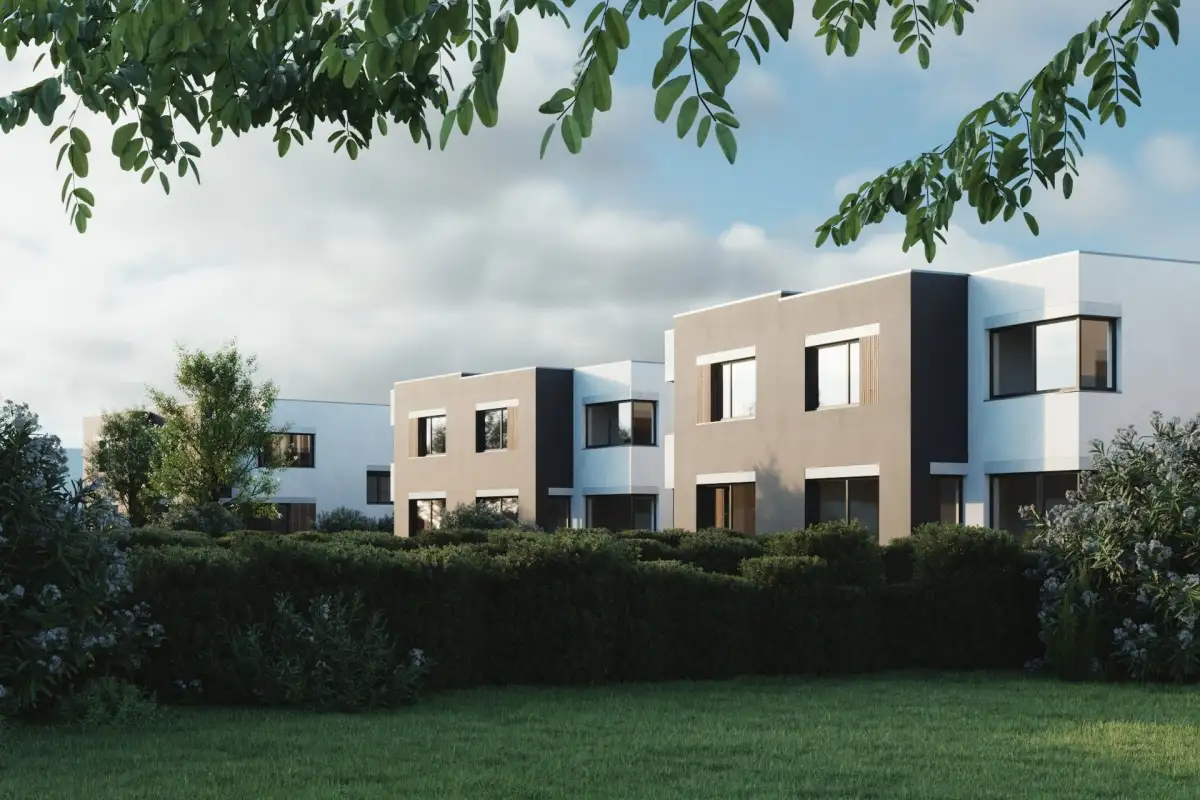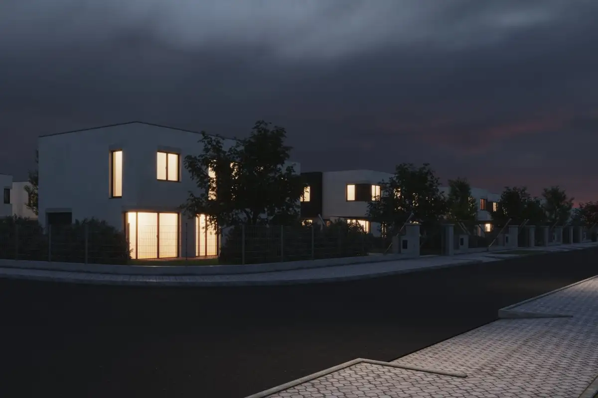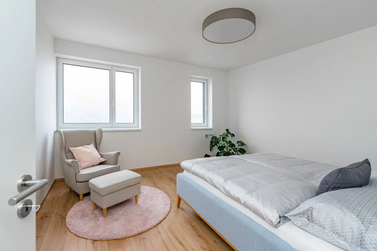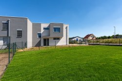 On the ground floor there is a hall, bathroom, laundry room, tech. room and then a living room pleasantly glazed to the garden and terrace. There is also an integrated garage with preparation for a charging station. Upstairs there is then a master bedroom with en-suite bathroom and dressing room, two children's bedrooms with a second bathroom and a storage room. The corridor above the staircase is illuminated by a skylight with preparation for electric drive. See attached floor plans for more details. On the floors there is quality laminate floating flooring (decor according to the house) and ceramic tiles. Bathroom equipment: Villeroy & Boch.