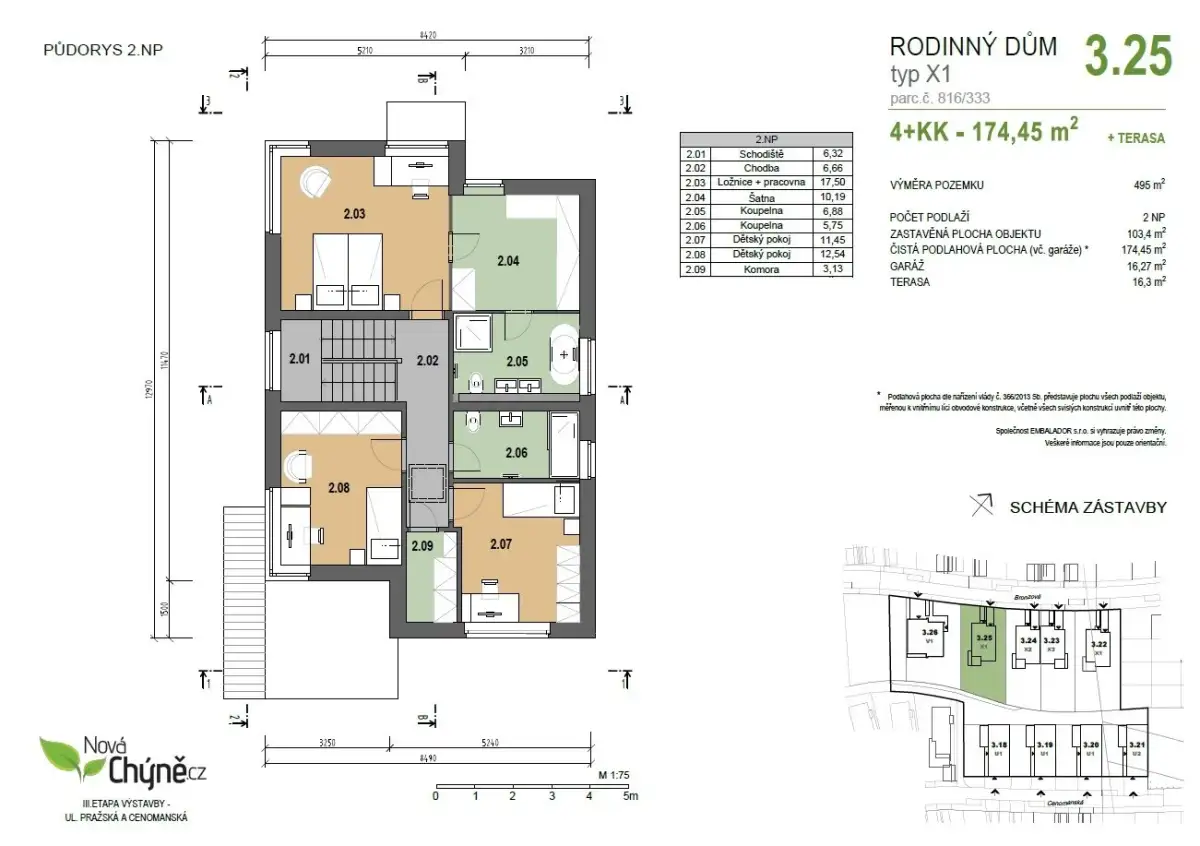 We offer a detached family house with a sunny garden in the project NEW CHÝNĚ, on the western outskirts of Prague - in the town of Chýně - with a commute of 14 km to the center of Prague. The project satisfies with location, quality of brick houses with practical layouts and gardens and technological sophistication. The offered family house has a layout of 4+kt, floor area of 174.4 sqm, total usable area of 174.5 sqm, including a terrace of 16.3 sqm. It stands on a plot of 495 sqm with a garden of 391 sqm. The house includes a garage for one car and one additional park. The parking is on its own plot.