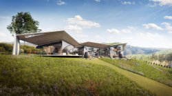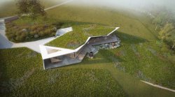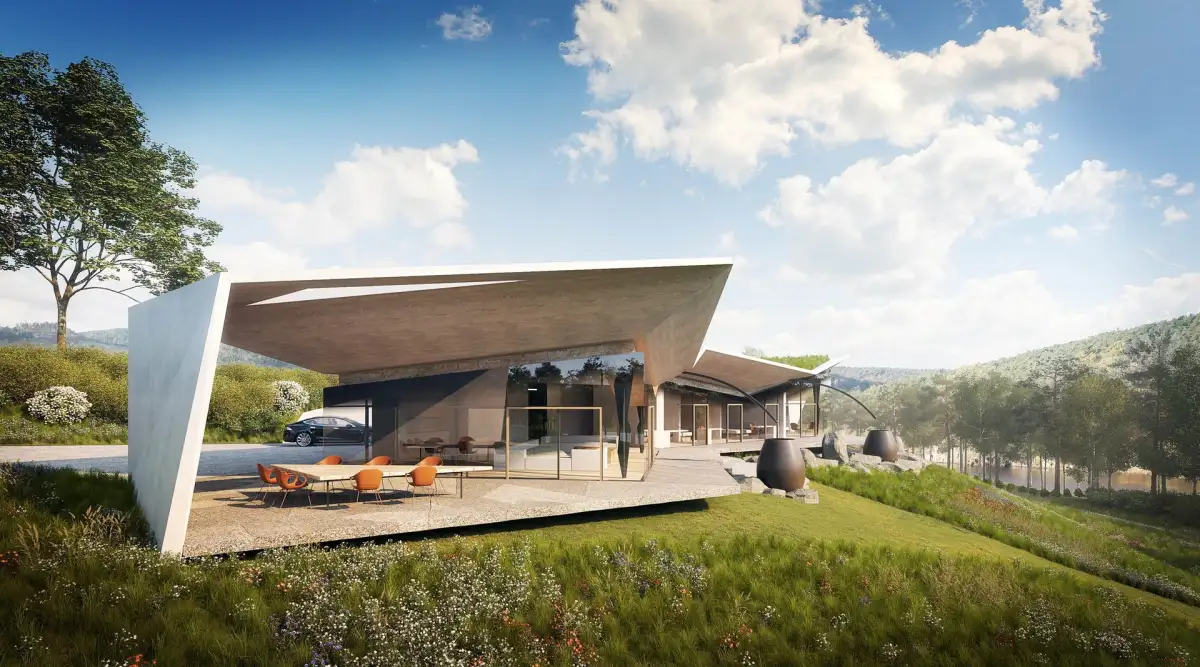 The residence is designed as a modern low-energy building with a green roof and sensitive integration into the terrain. The architectural design works with distinctive roof overhangs that maximize views of the river and the wooded slopes opposite, provide a high degree of privacy, and ensure natural shading during the summer months. The design includes a spacious double garage with capacity for a motorhome. The project also allows for the addition of an outdoor swimming pool – its location has already been architecturally prepared.
