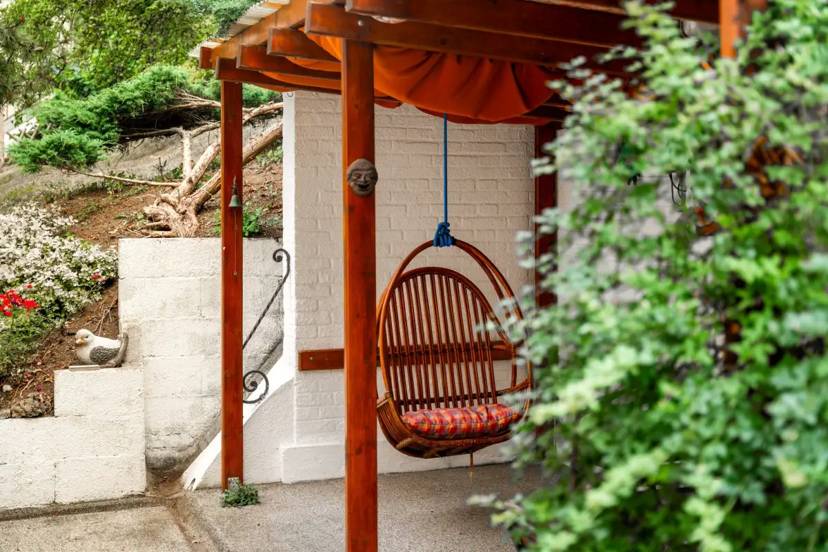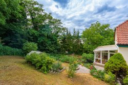 Thanks to the sloping terrain, the garden is divided into several sections and offers a number of pleasant nooks. There is a pergola with seating, an outdoor cellar, storage space for garden tools, and space for growing vegetables, fruit, and flowers.
