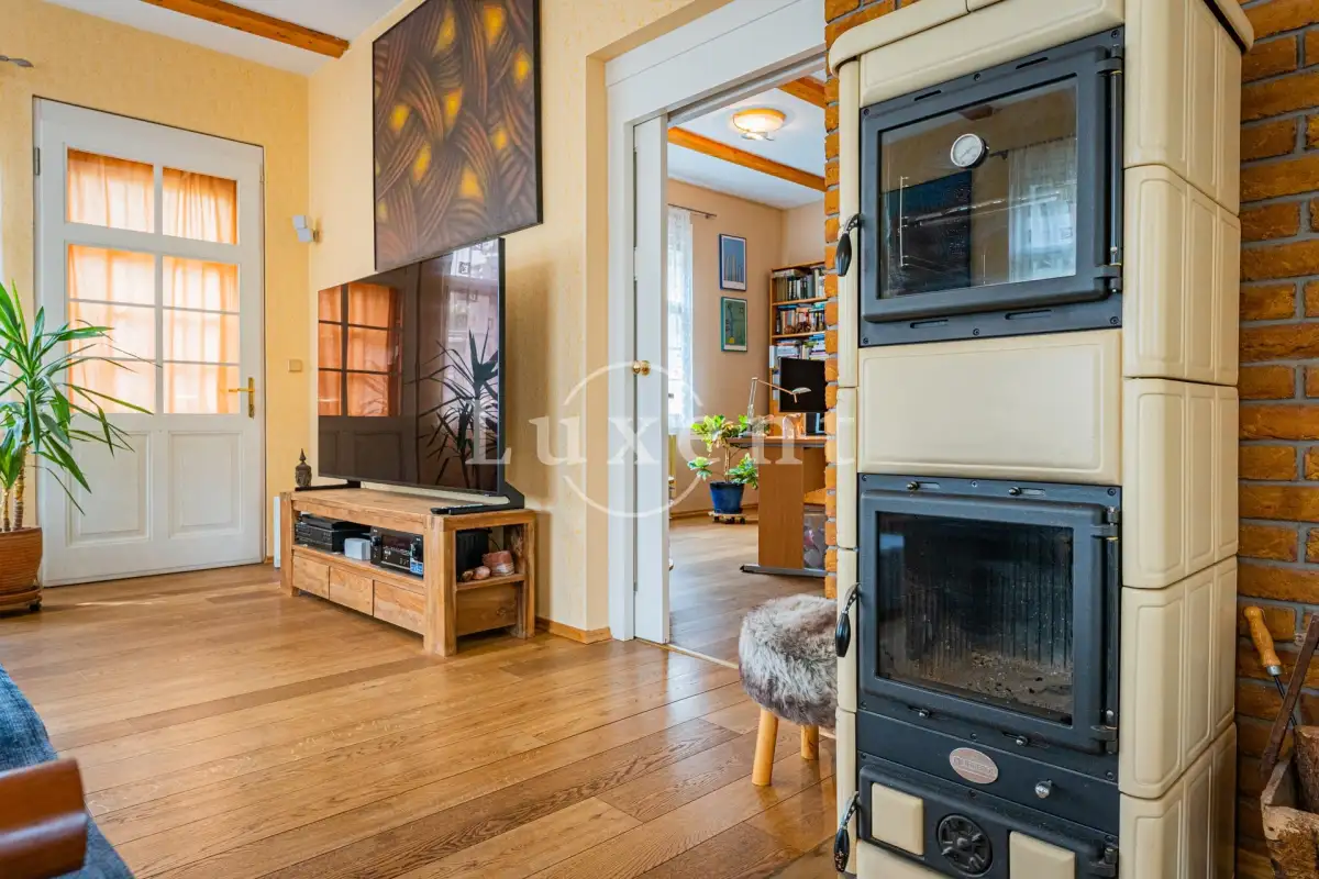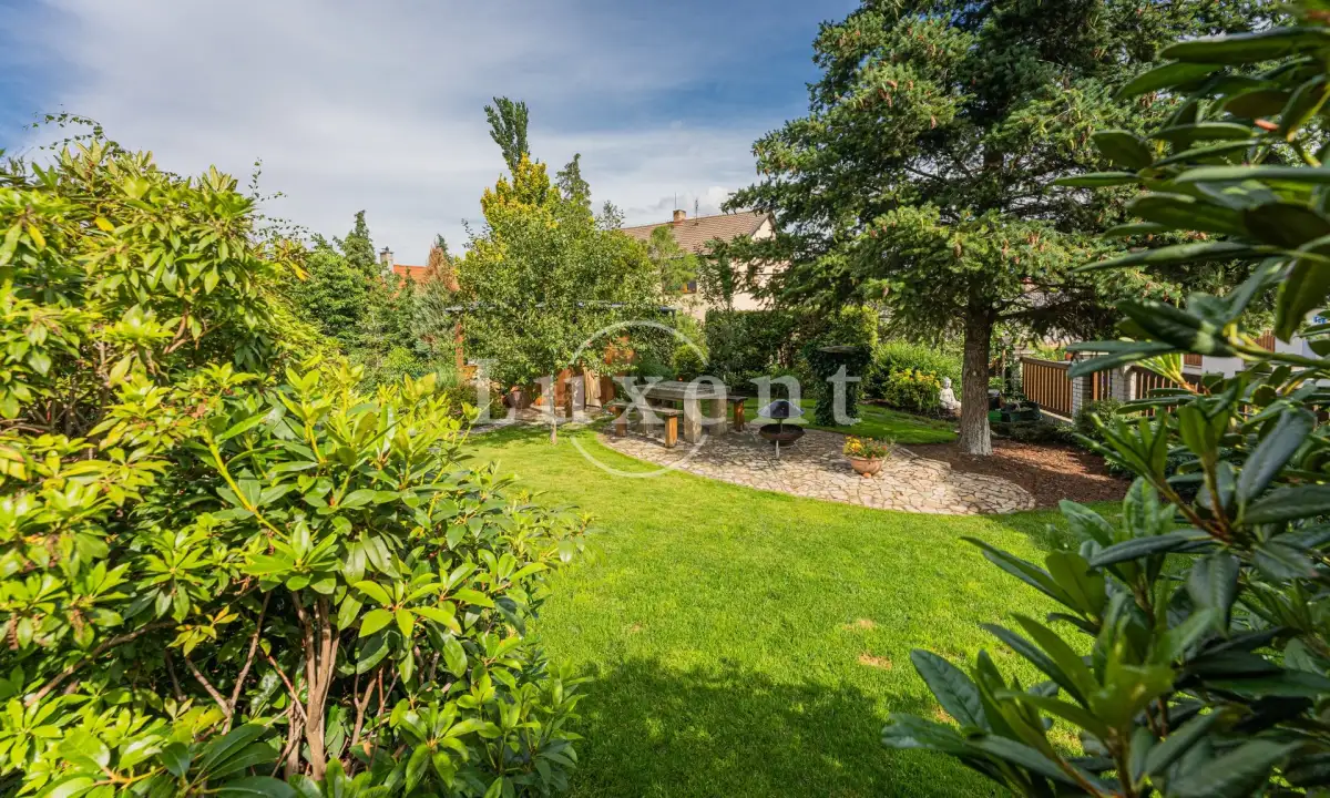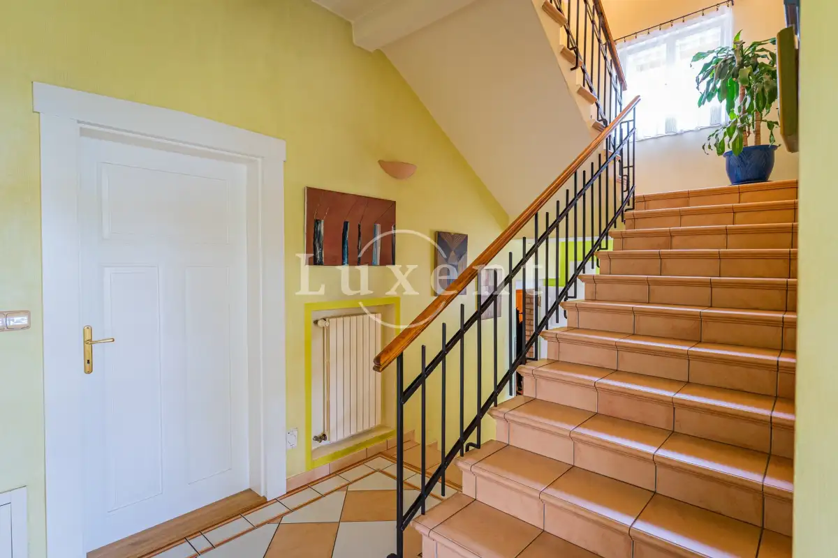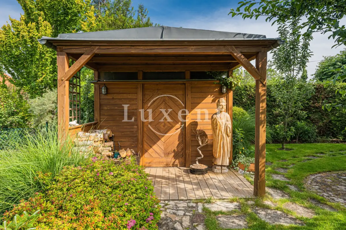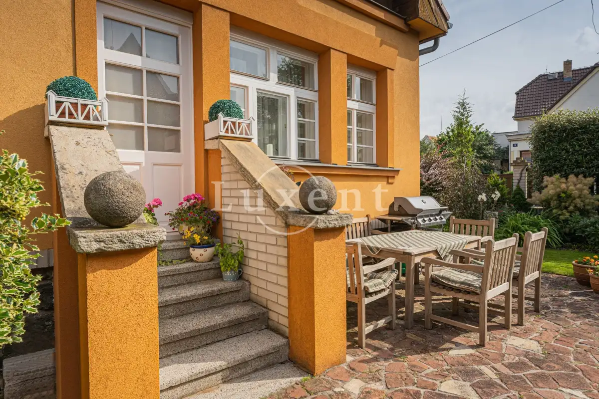 Set in the greenery of a quiet residential area, the villa is surrounded by a 513 sqm perfectly maintained garden with stone walkways and wooden garden accessories. Part of the garden in front of the house is a brick-stone decorative pond with fish, comfortable seating made of teak wood and barbecue. In the back, which connects to the outdoor terrace, there is a stone table and a stylish garden house in the corner. According to the architects design, a replica of the original fencing made of white facing bricks and wooden fields was newly built around the entire plot towards the street.