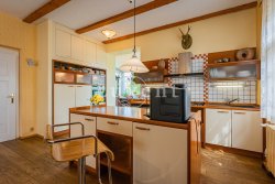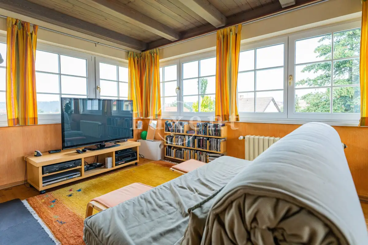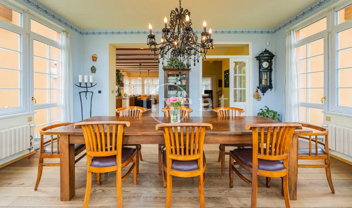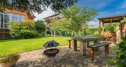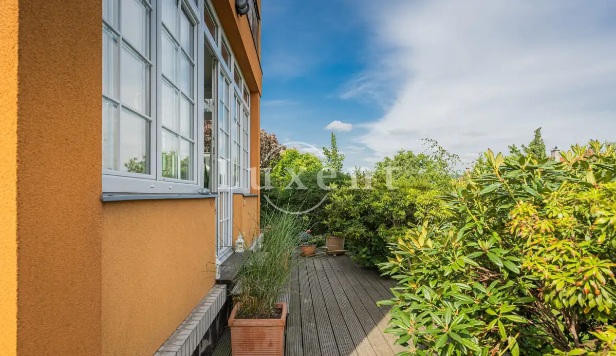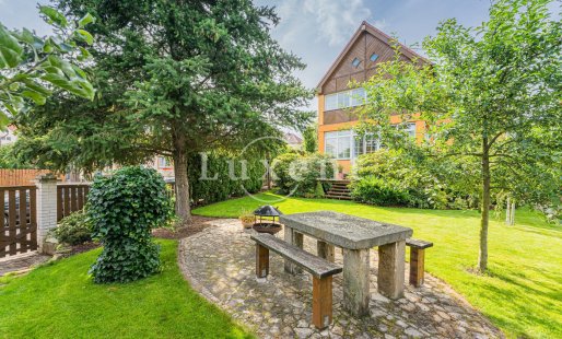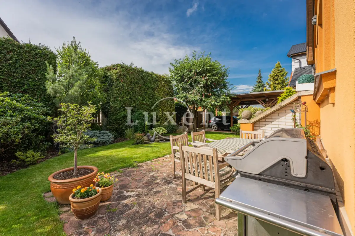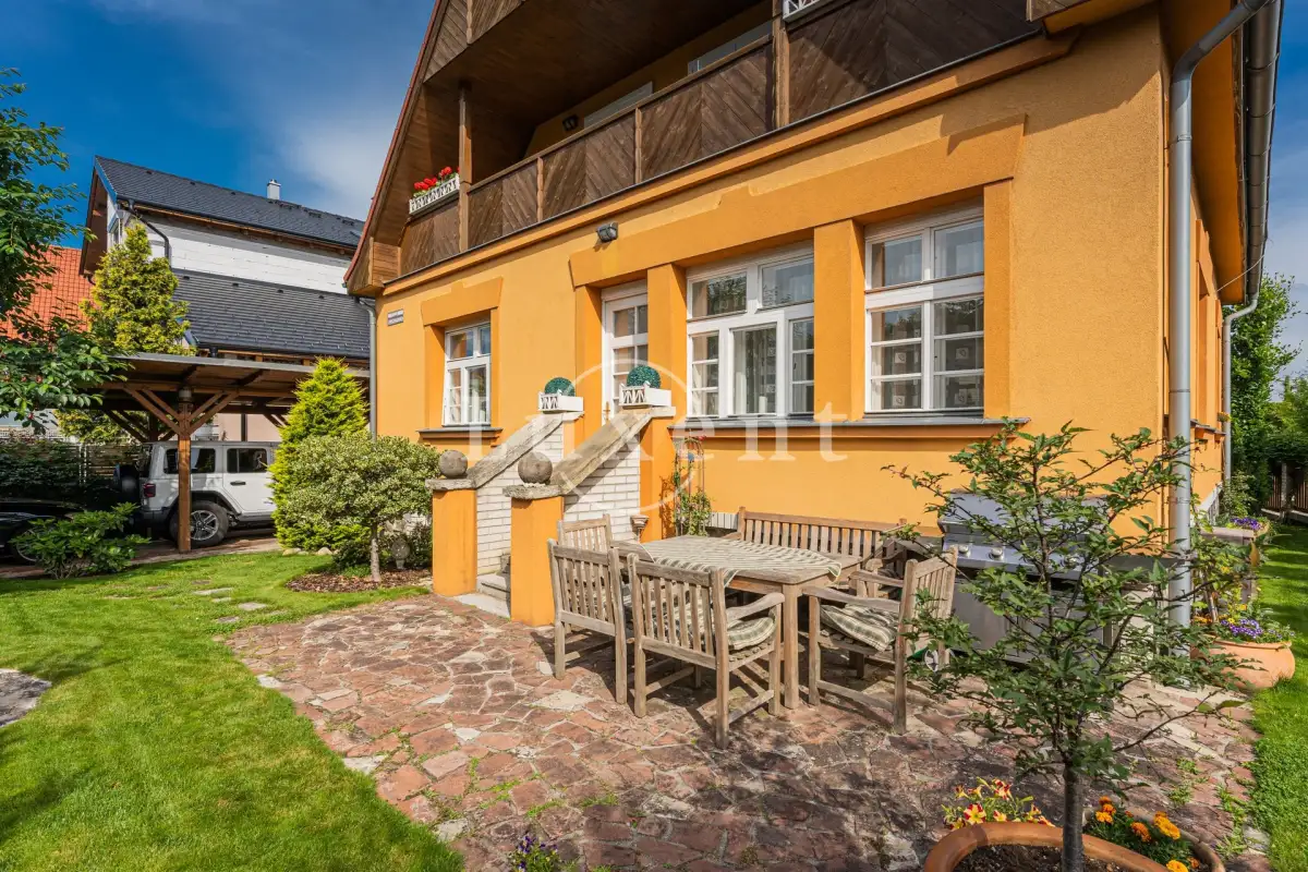 Set in the greenery of a quiet residential area, the villa is surrounded by a 513 sqm perfectly maintained garden with stone walkways and wooden garden accessories. Part of the garden in front of the house is a brick-stone decorative pond with fish, comfortable seating made of teak wood and barbecue. In the back, which connects to the outdoor terrace, there is a stone table and a stylish garden house in the corner. According to the architects design, a replica of the original fencing made of white facing bricks and wooden fields was newly built around the entire plot towards the street.