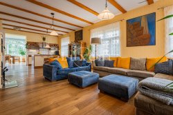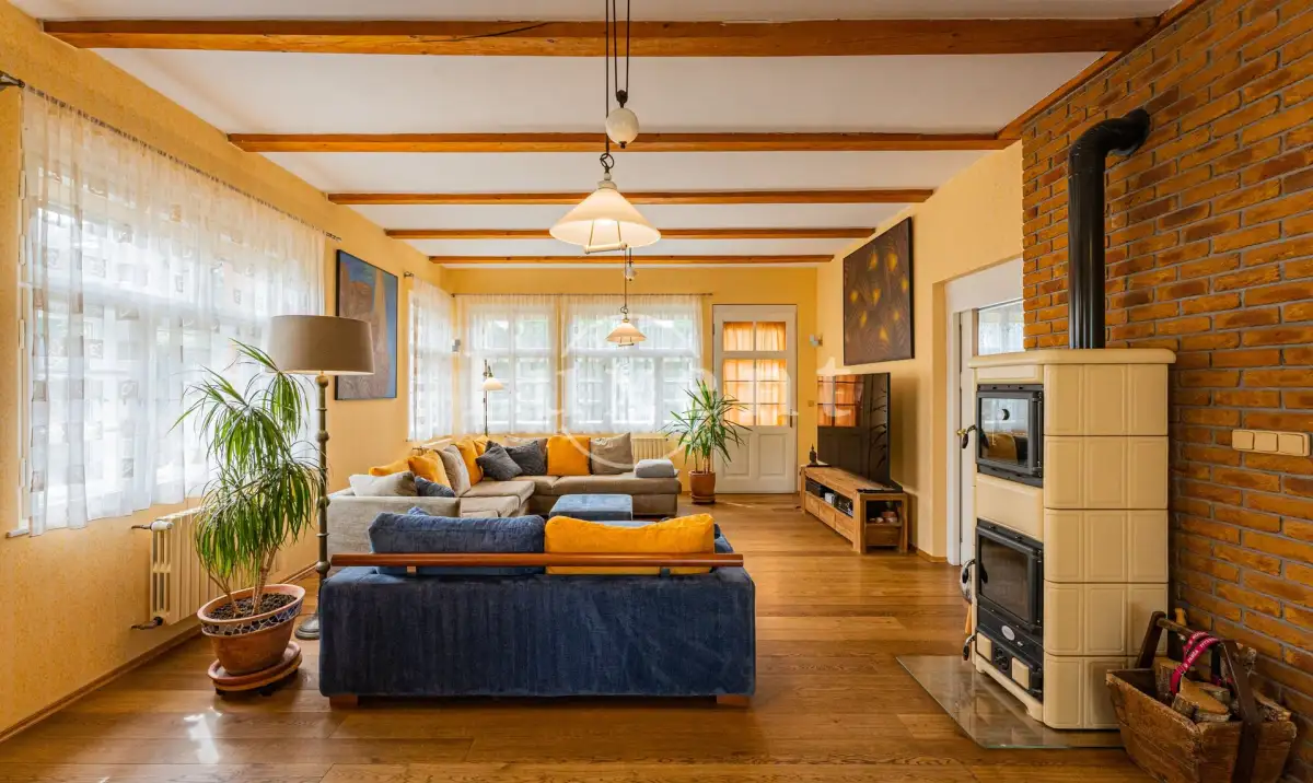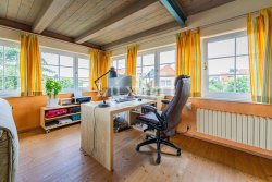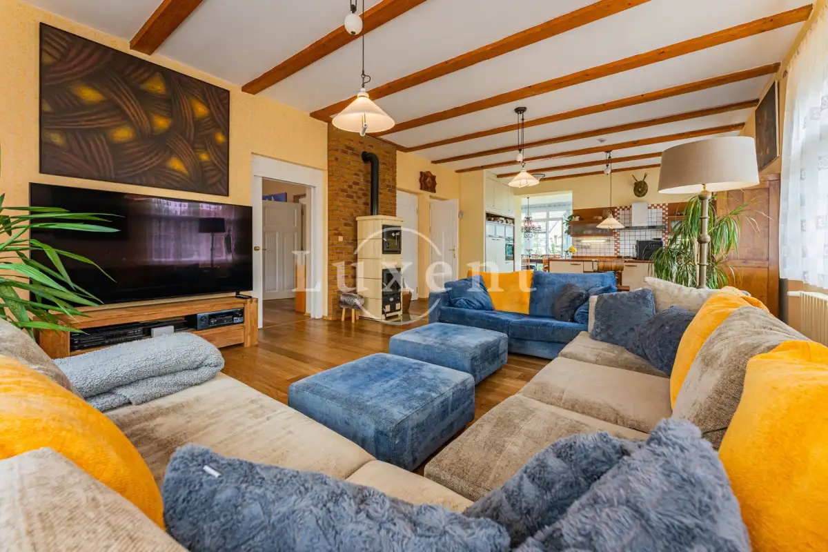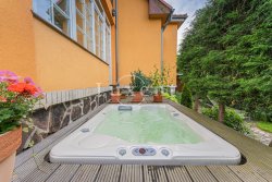 The entire ground floor serves as the main living area with a fireplace tiled stove equipped with an oven. It is loosely connected to the open kitchen and kitchen island equipped with built-in branded appliances Siemens and Liebherr. Adjacent spacious dining room in a glass annex has a panoramic view, entrance to the terrace and garden at the back of the house. There is also a study separable by a sliding door and a bathroom with a toilet. The outdoor terrace is made of tropical wood and has a hot tub for four people.