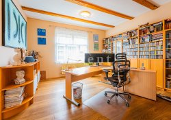 Villa 9+1 with a usable area of 395 sqm is located on a corner plot in Čechov district, which is part of Modřany, Prague 4. The house is entered from the vestibule, which is connected to a covered stylish wooden parking shed for two cars, from where is an access to the main living area and the basement. There is a laundry room, boiler room and workshop/warehouse.