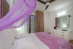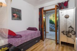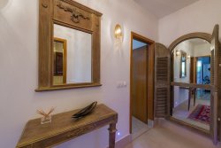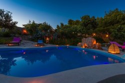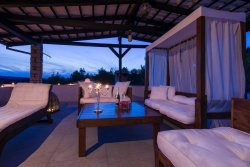 The main house offers three bedrooms, each with access to a veranda or terrace where you can enjoy your morning coffee with a view of the garden. The living room with a fully equipped kitchen is connected to a covered terrace and summer kitchen. The roof terrace has a relaxation area with sun loungers where you can enjoy unique sunsets.