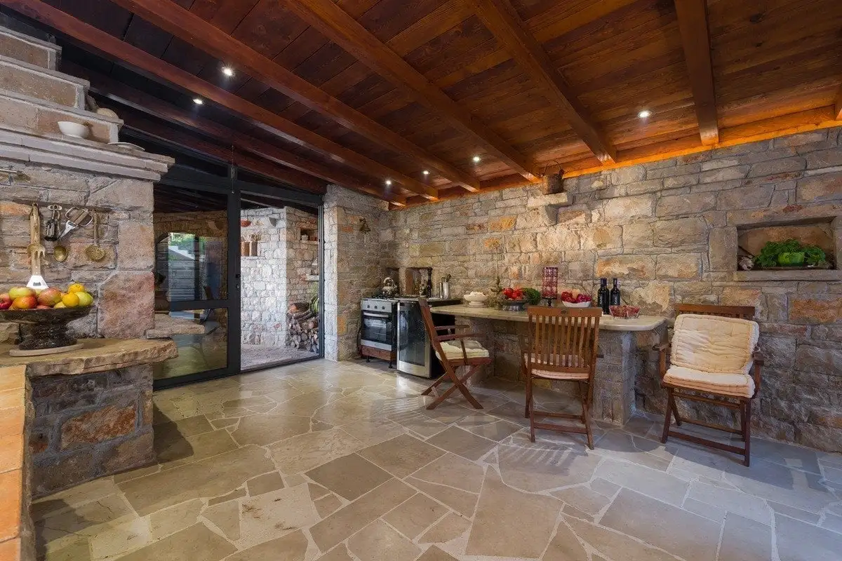 The property includes a main house and a separate guest house, originally a church chapel, both built of natural stone. The interiors are spacious and elegant, with a warm atmosphere and refined details. The villa has large terraces, outdoor dining areas, and a large summer kitchen with a barbecue—the perfect space for relaxing moments with family and friends.