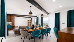 The villa was built on three floors and its interiors and exteriors were designed with an emphasis on comfort, elegance, and connection with the surrounding nature. It offers a total of five spacious bedrooms and six bathrooms, which are arranged so that each guest has plenty of privacy. There is also a fully equipped gym, a recreation room, a modern kitchen with a living area, and several balconies and terraces—both covered and open—ideal for relaxing and dining with a view of the sea.