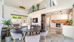 The villa is spread over three floors and has a total living area of 96 m². On the ground floor, there is a spacious living room that flows seamlessly into a modern, fully equipped kitchen and dining area with a round table – ideal for spending time with family or friends. This floor also features the first bedroom with its own bathroom, providing comfortable accommodation for guests or family members.